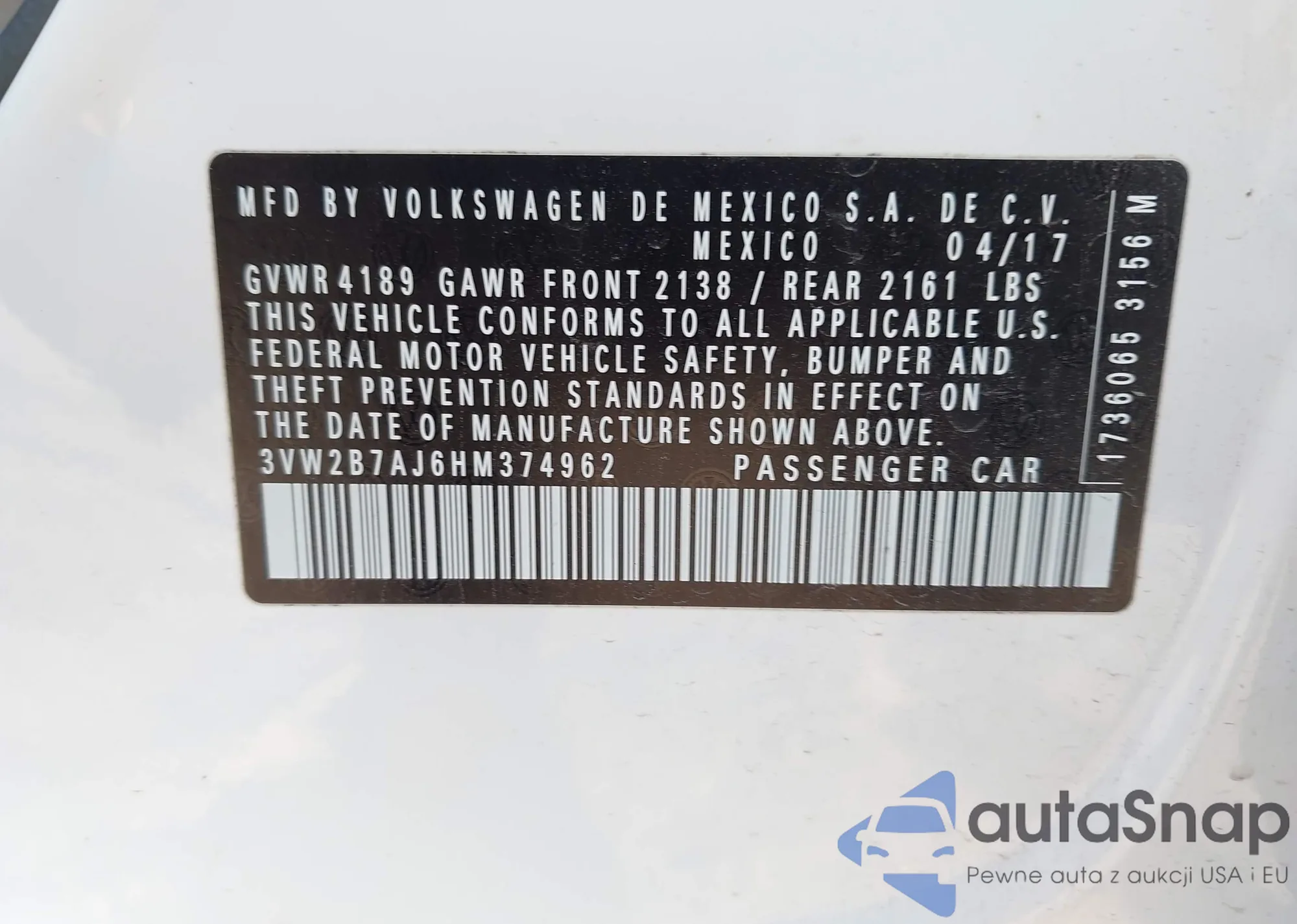 • VIN 3VW2B7AJ6HM374962