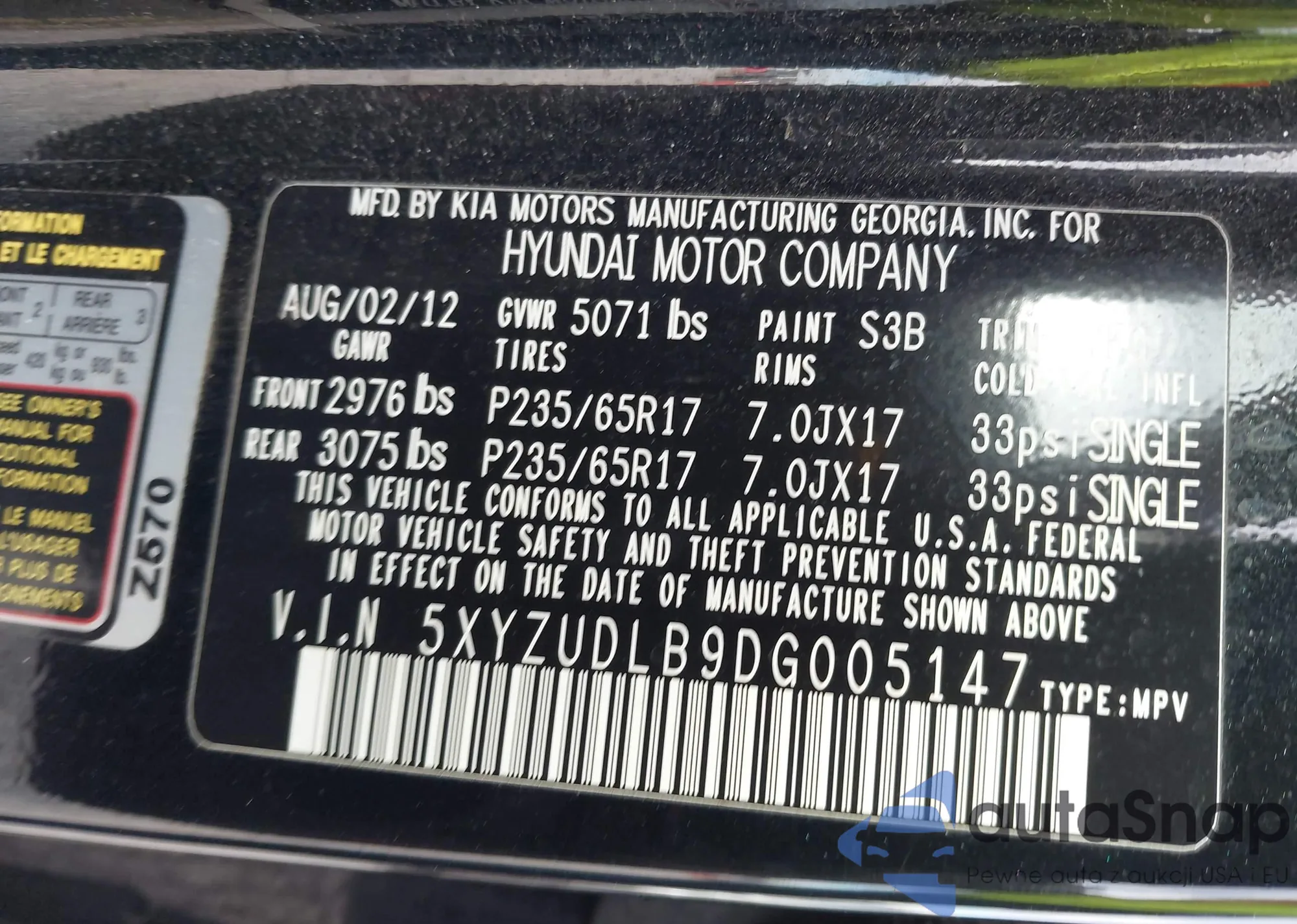 • VIN 5XYZUDLB9DG005147