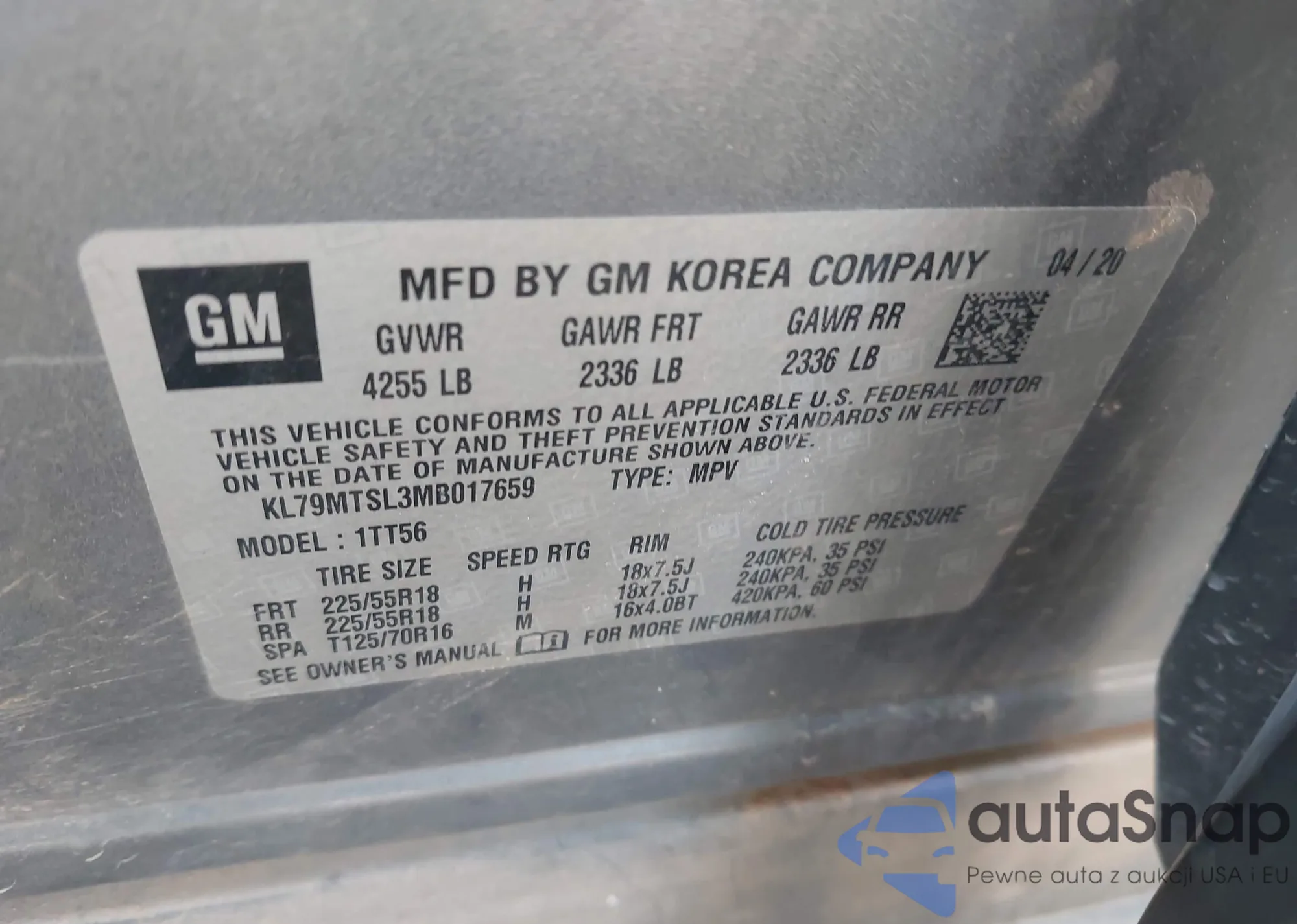 • VIN KL79MTSL3MB017659