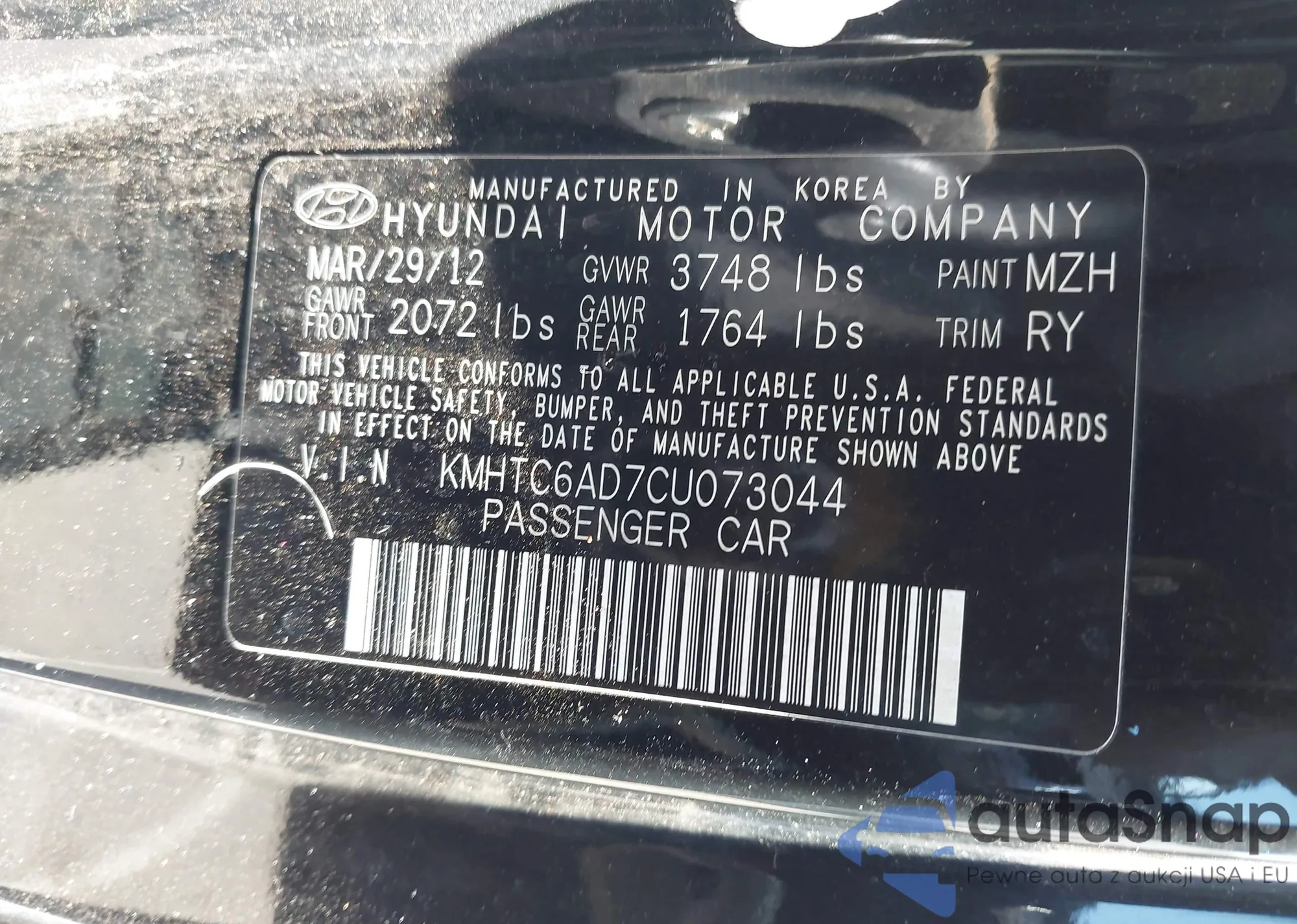LOT: 43844924 VIN: KMHTC6AD7CU073044