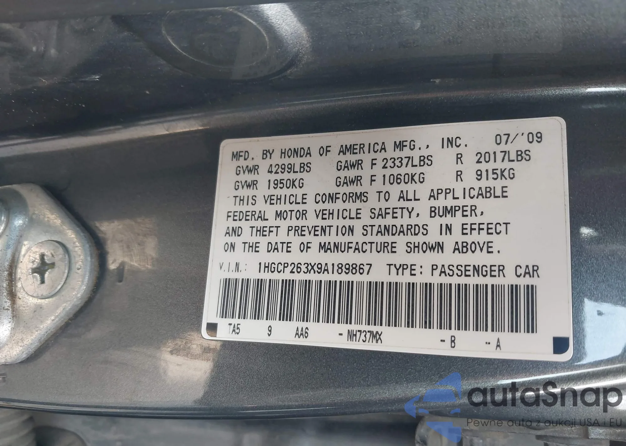 LOT: 43796890 VIN: 1HGCP263X9A189867