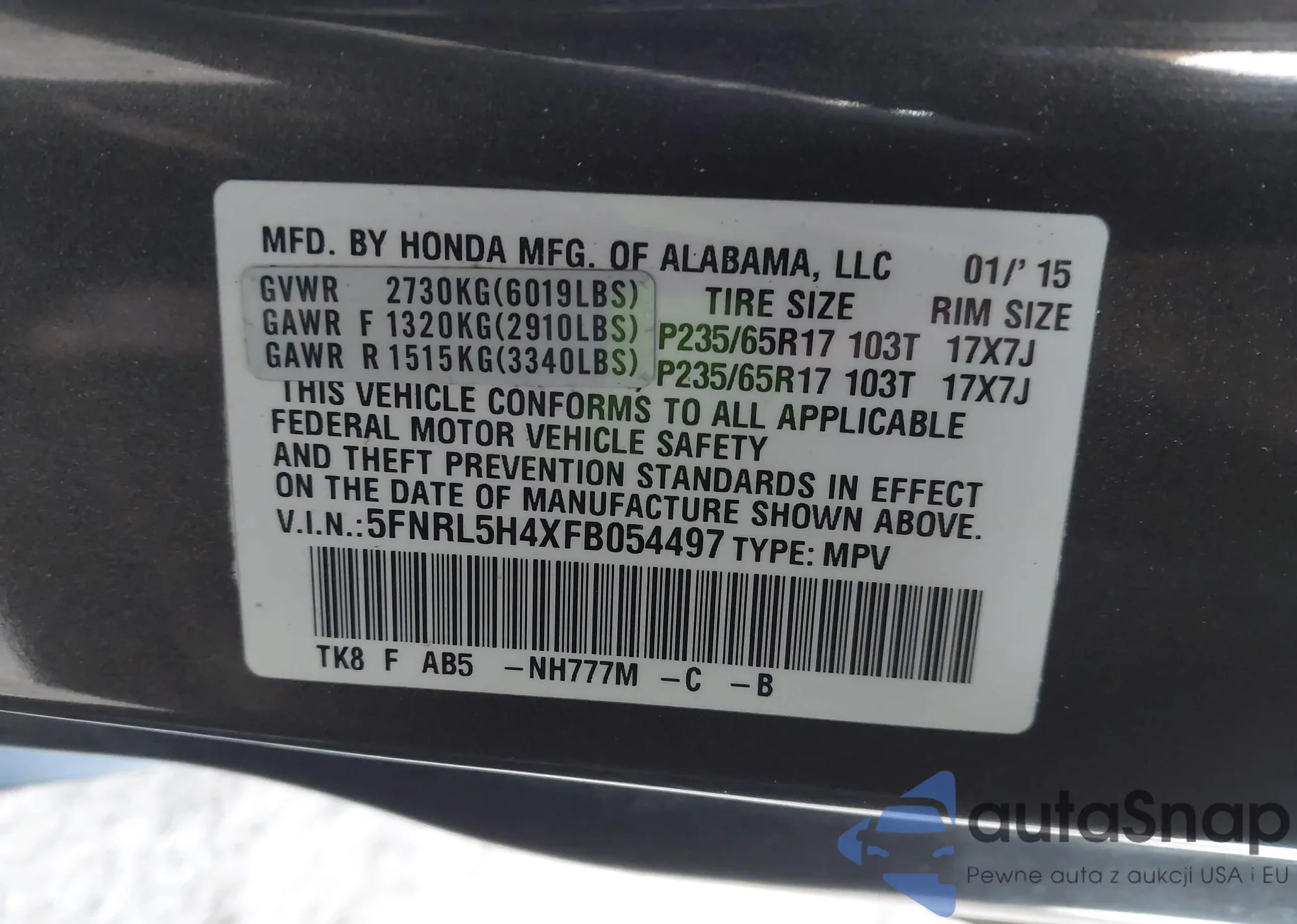 • VIN 5FNRL5H4XFB054497