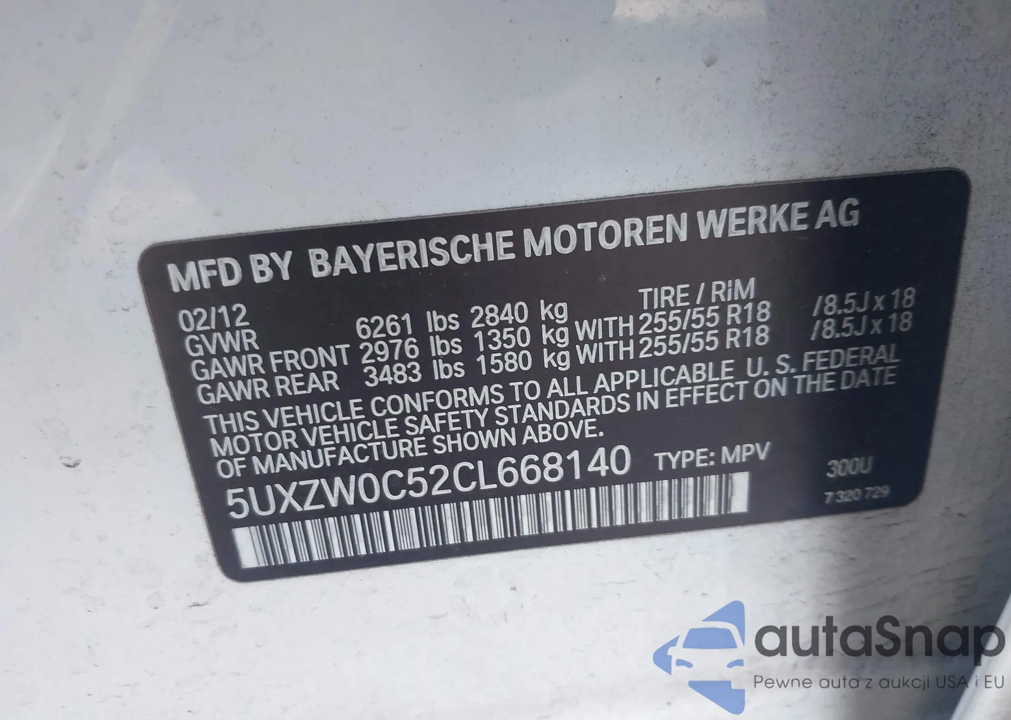 LOT: 43827861 VIN: 5UXZW0C52CL668140