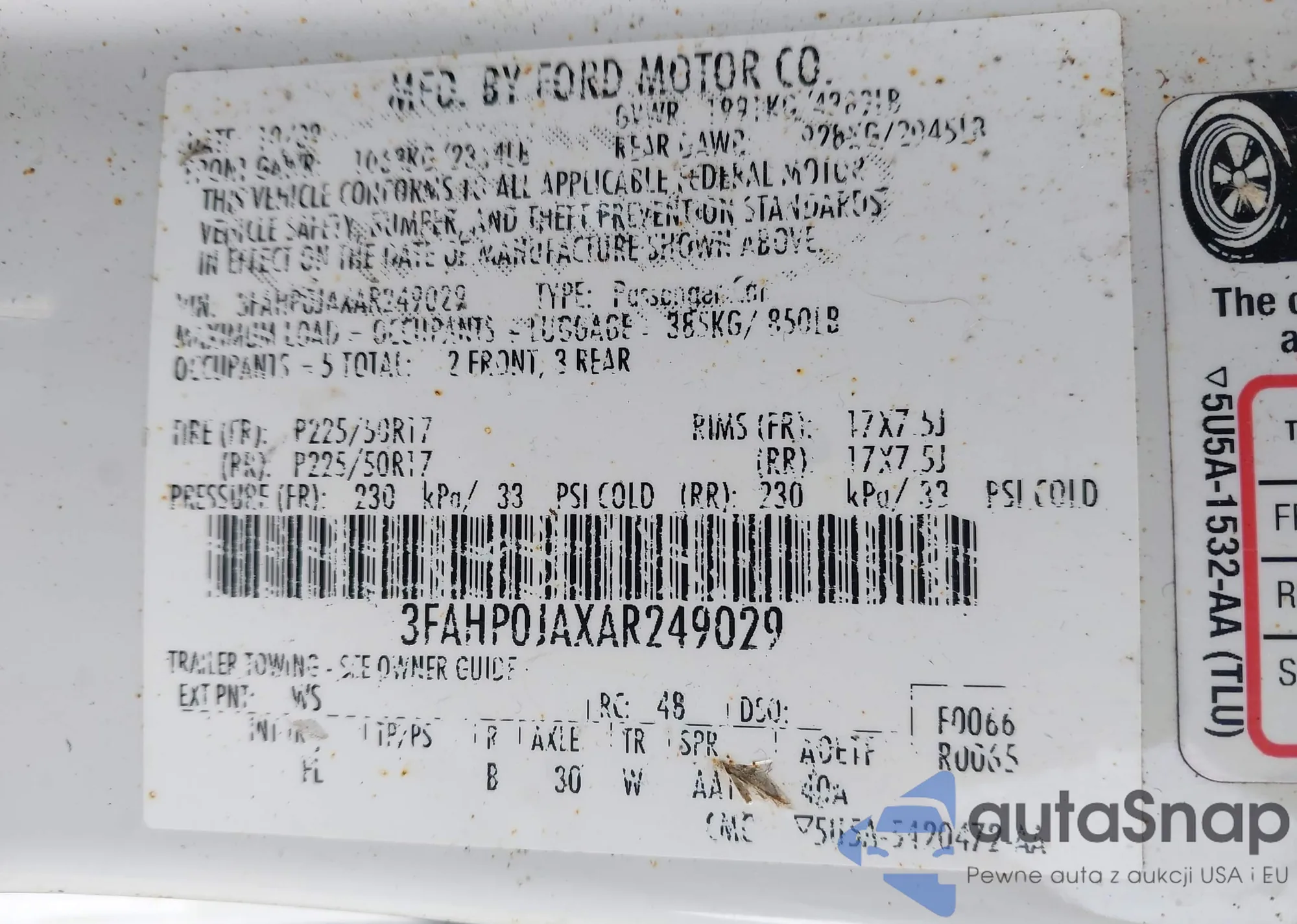 LOT: 43813634 VIN: 3FAHP0JAXAR249029