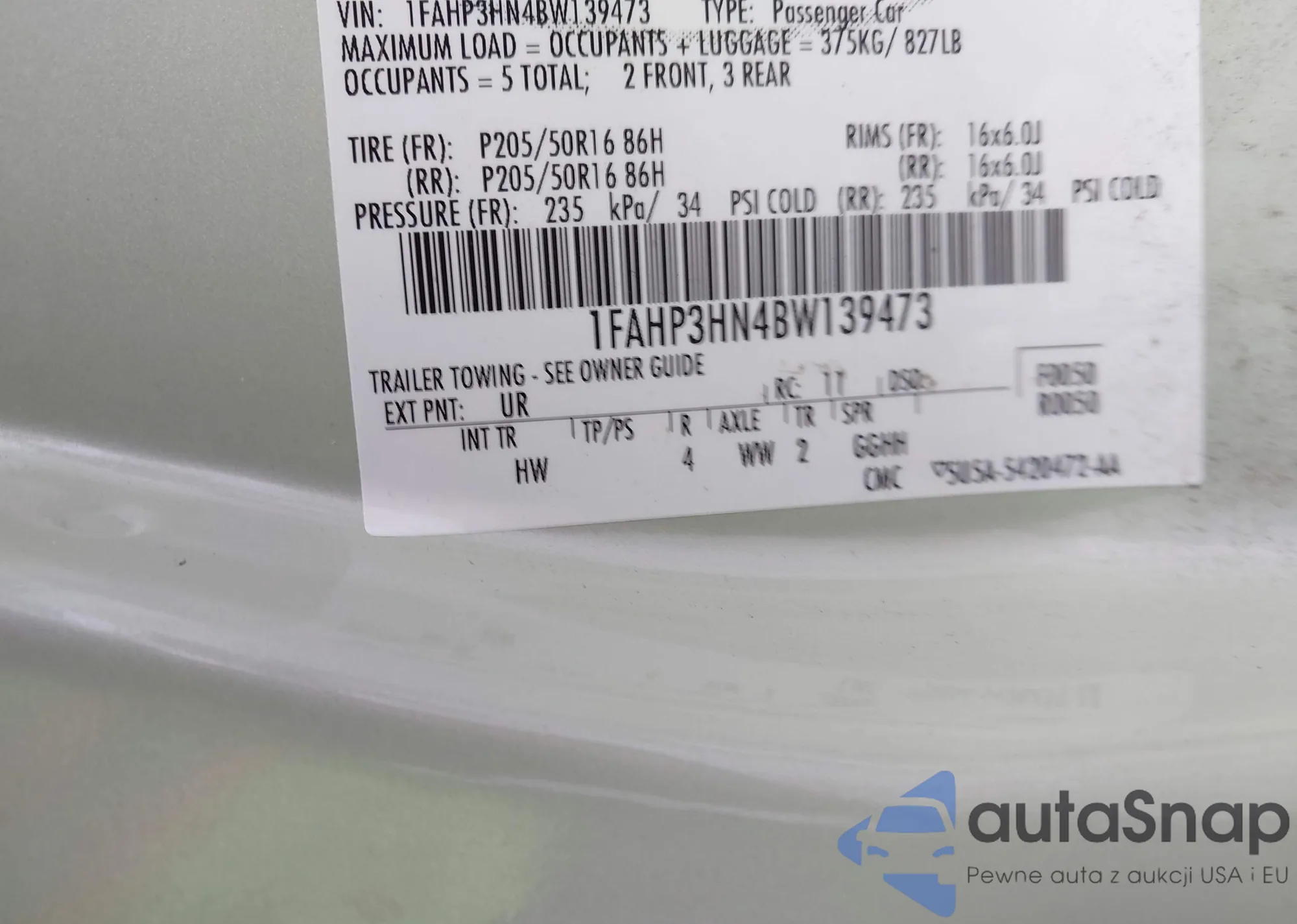 • VIN 1FAHP3HN4BW139473