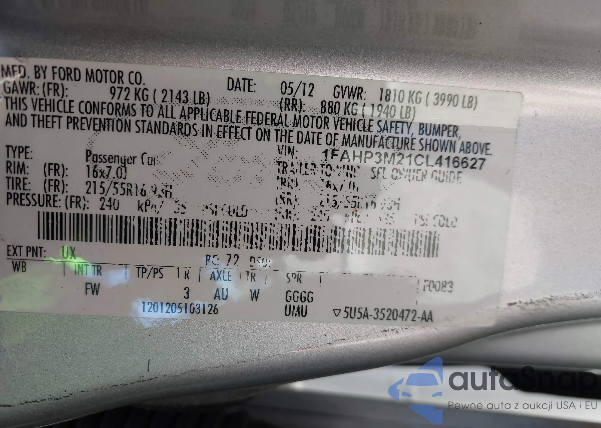LOT: 43918775 VIN: 1FAHP3M21CL416627