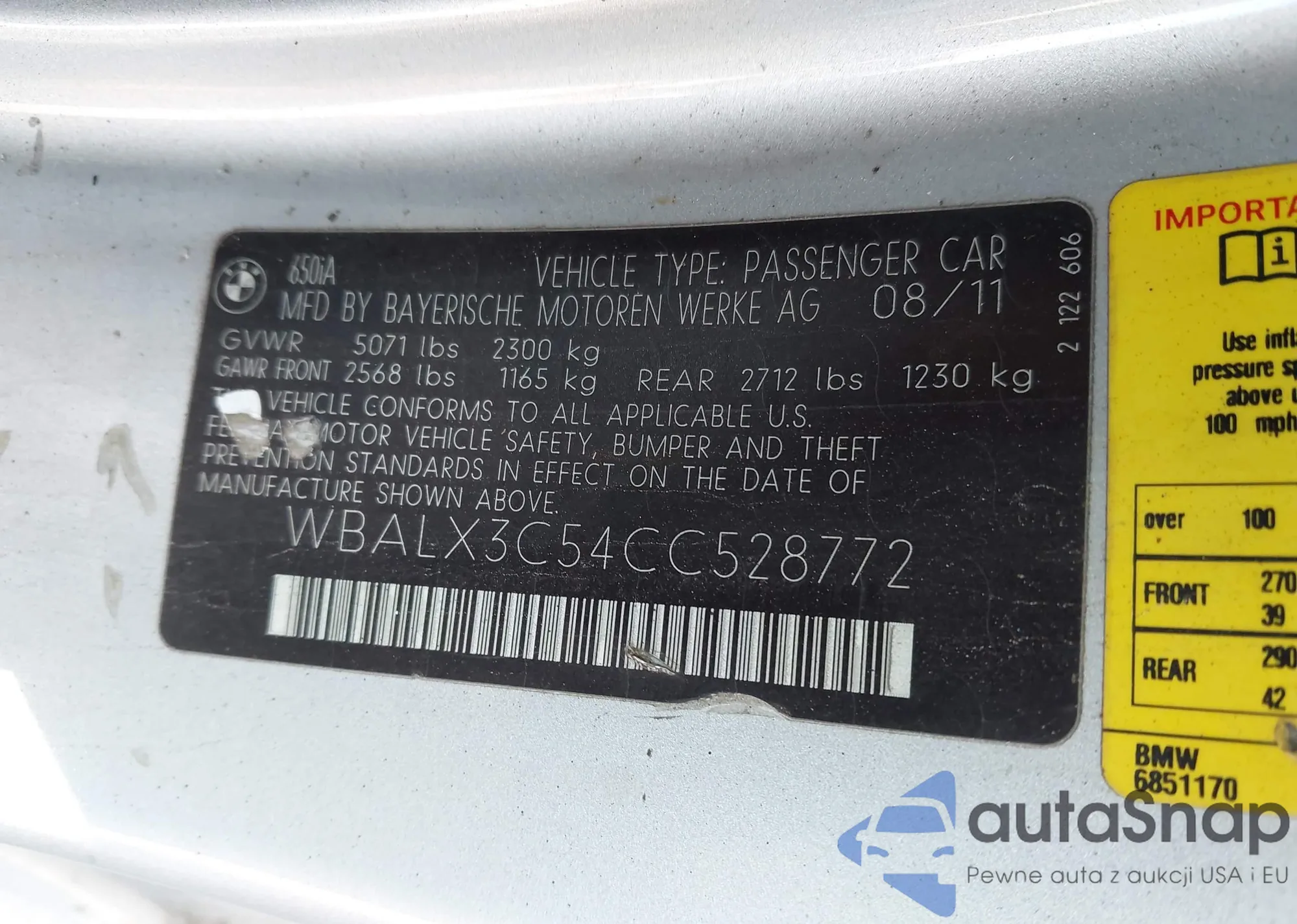 2012 BMW 650I из США, поврежденный, VIN WBALX3C54CC528772