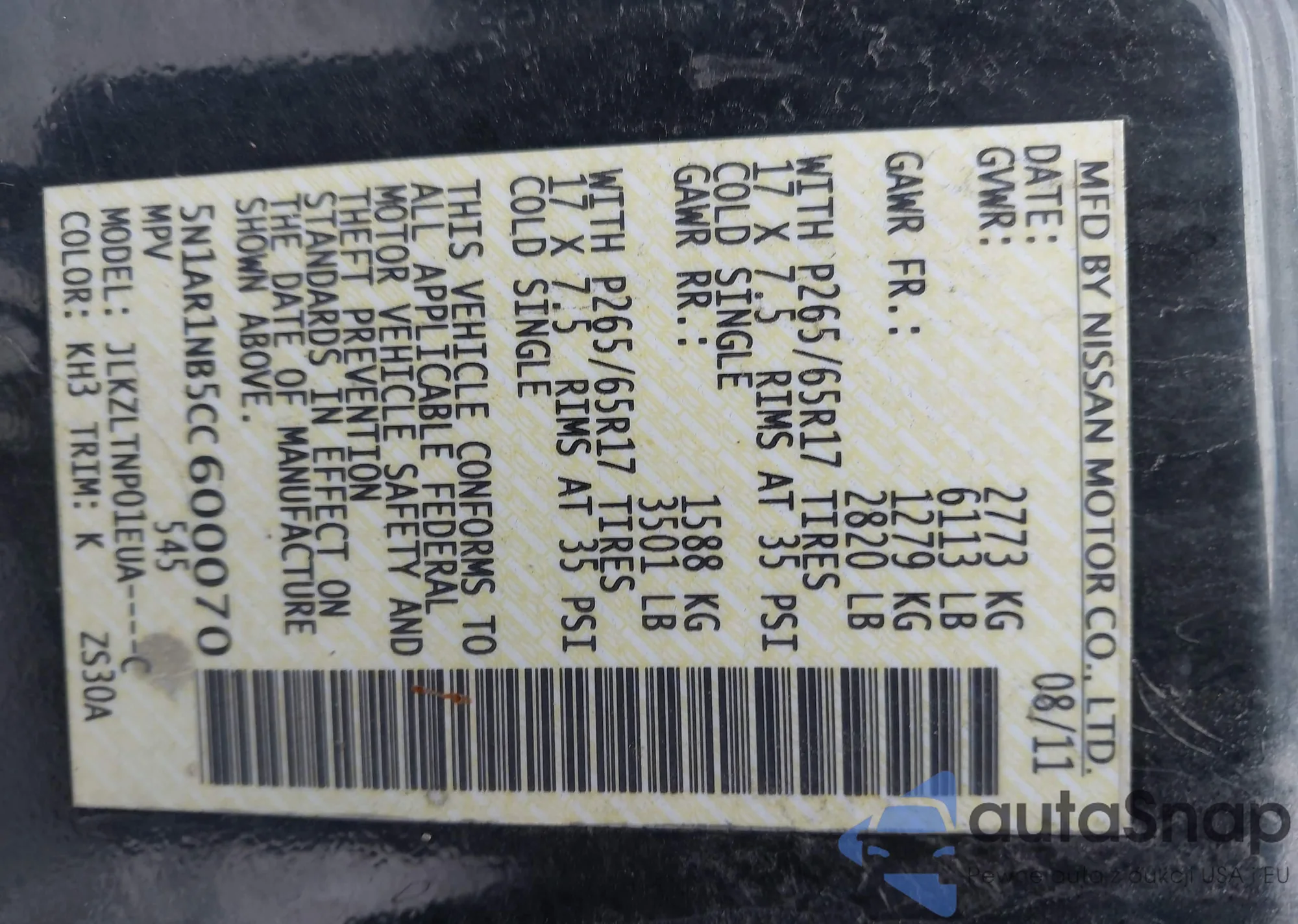 • VIN 5N1AR1NB5CC600070