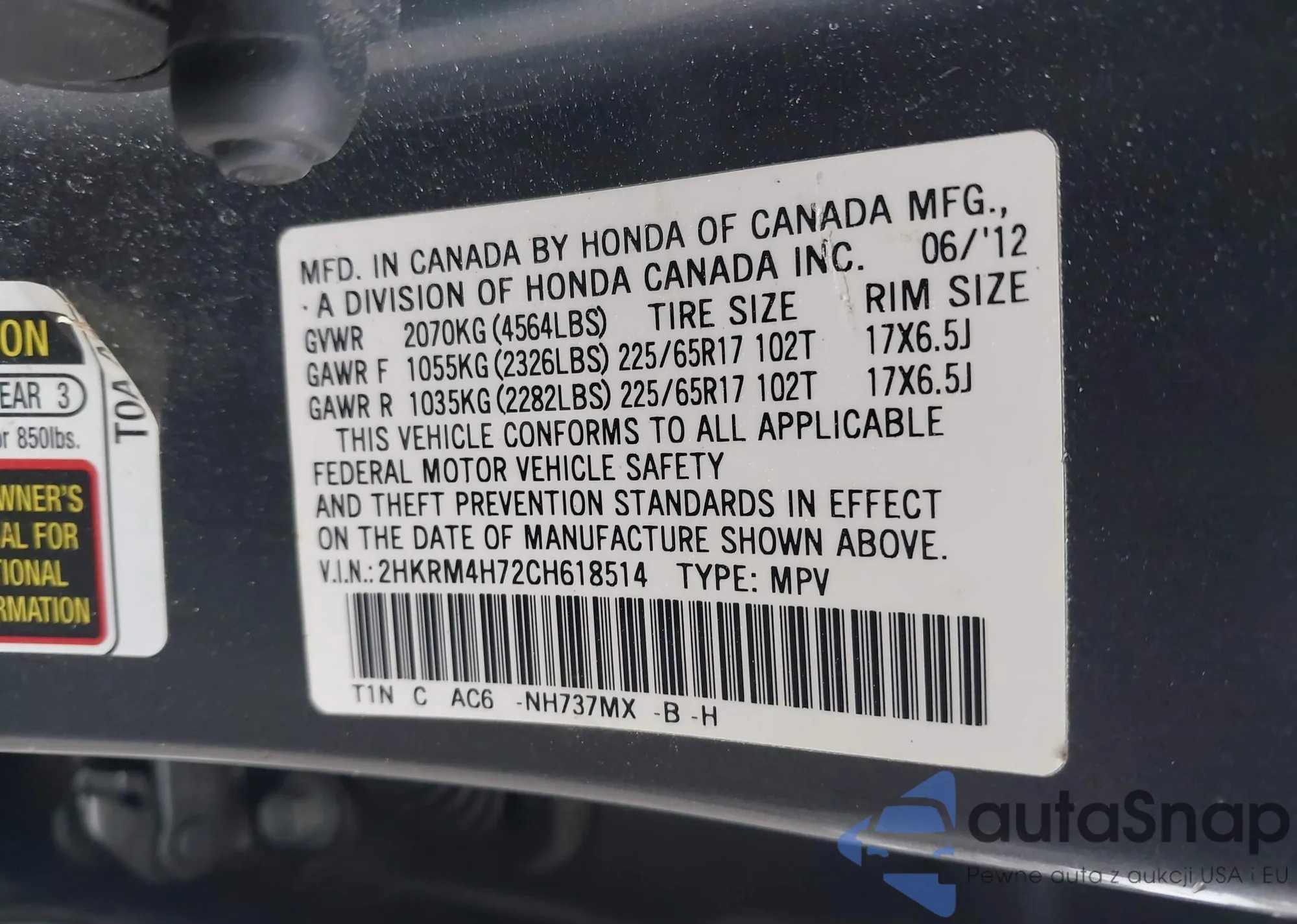 • VIN 2HKRM4H72CH618514