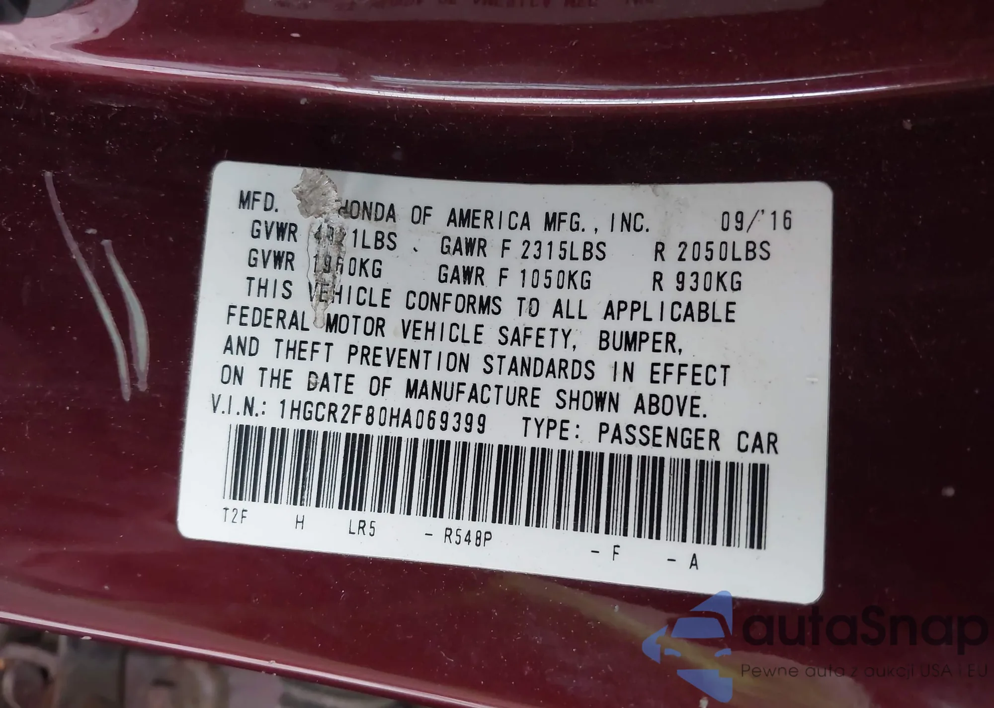 LOT: 43956084 VIN: 1HGCR2F80HA069399