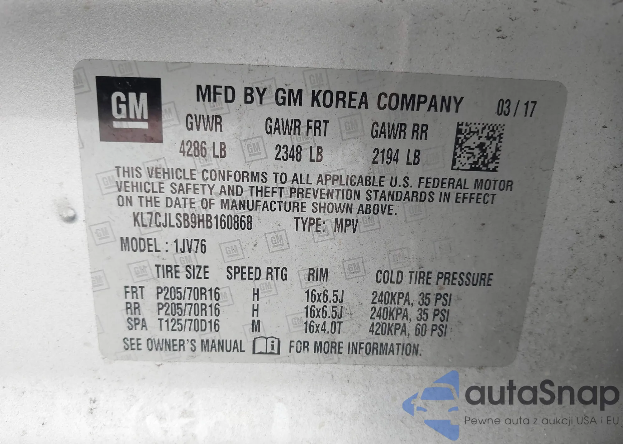 LOT: 43974229 VIN: KL7CJLSB9HB160868