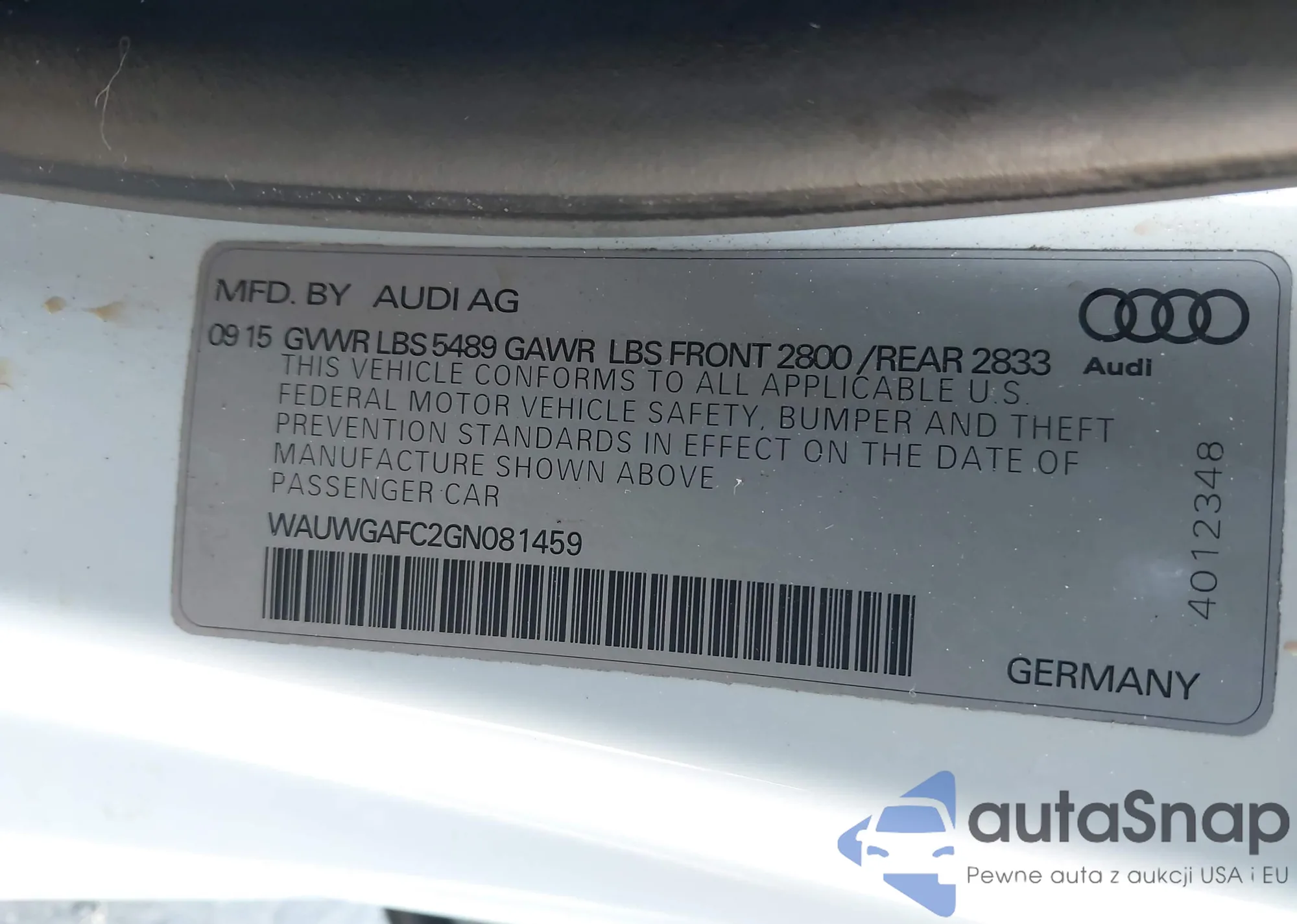 • VIN WAUWGAFC2GN081459
