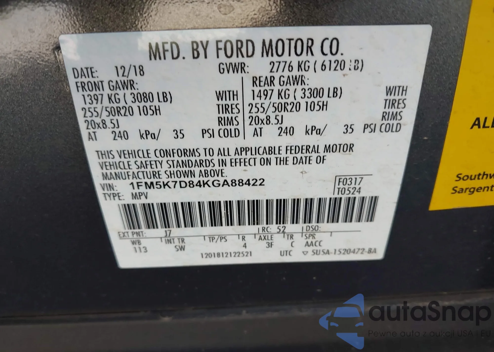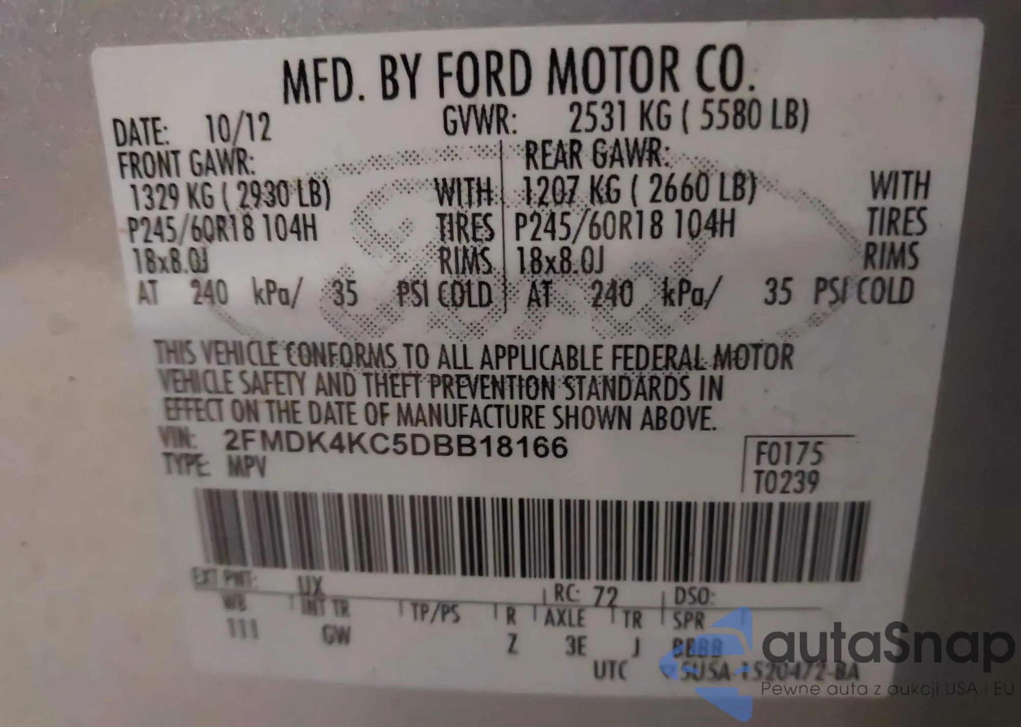 LOT: 43832587 VIN: 2FMDK4KC5DBB18166