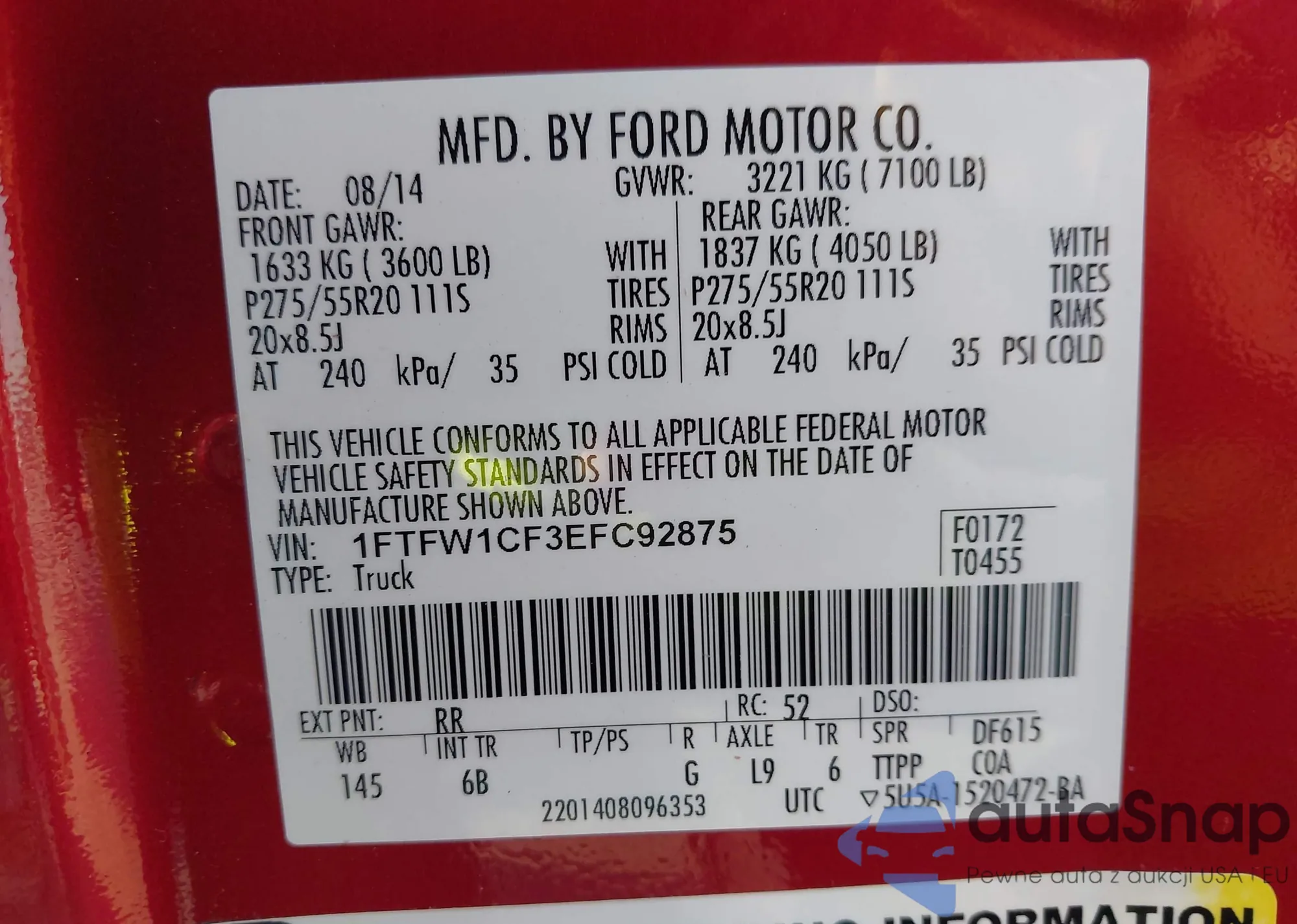 LOT: 43581821 VIN: 1FTFW1CF3EFC92875