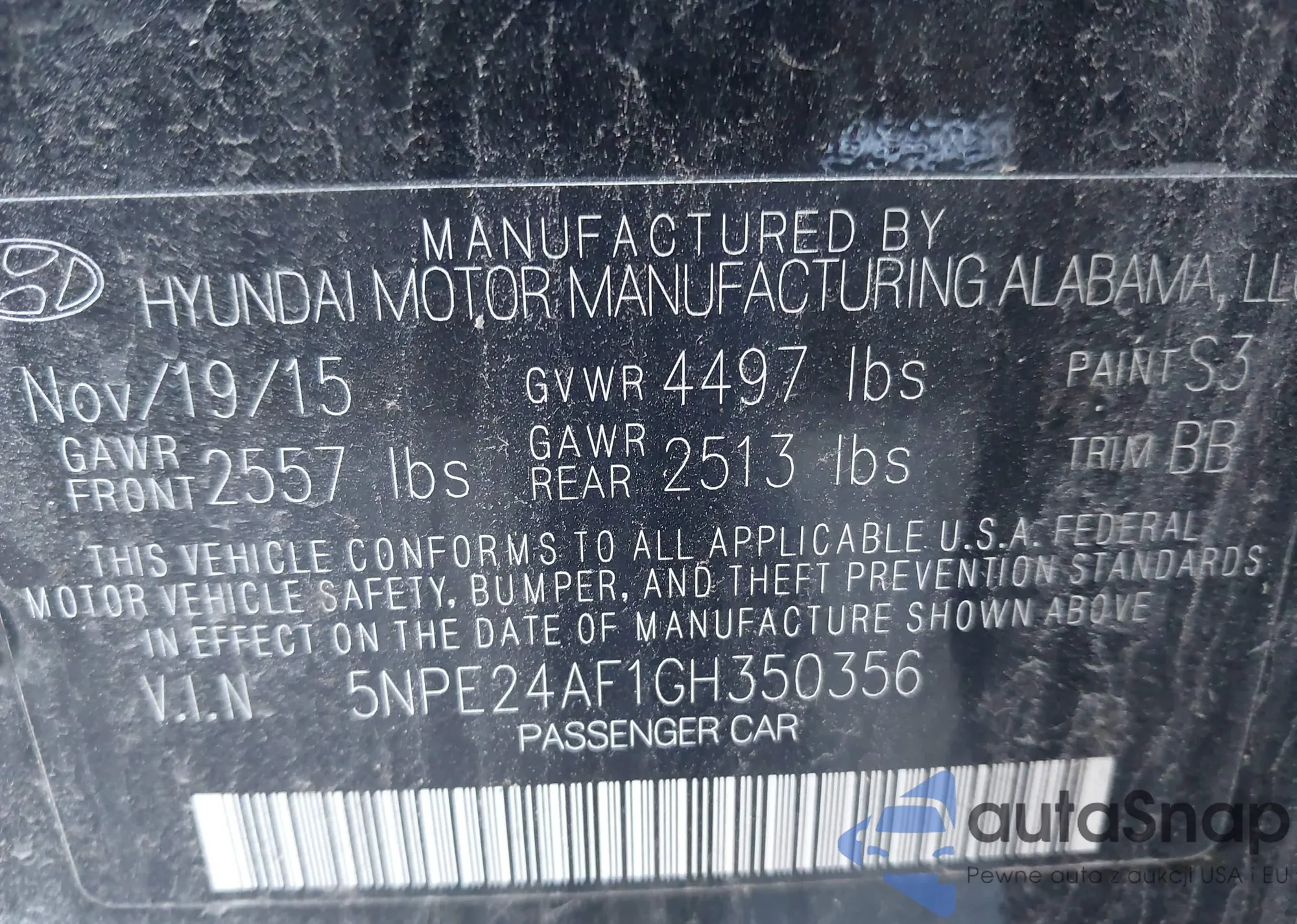 • VIN 5NPE24AF1GH350356