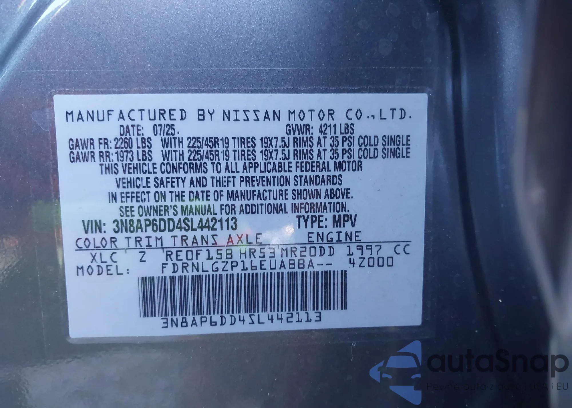 • VIN 3N8AP6DD4SL442113