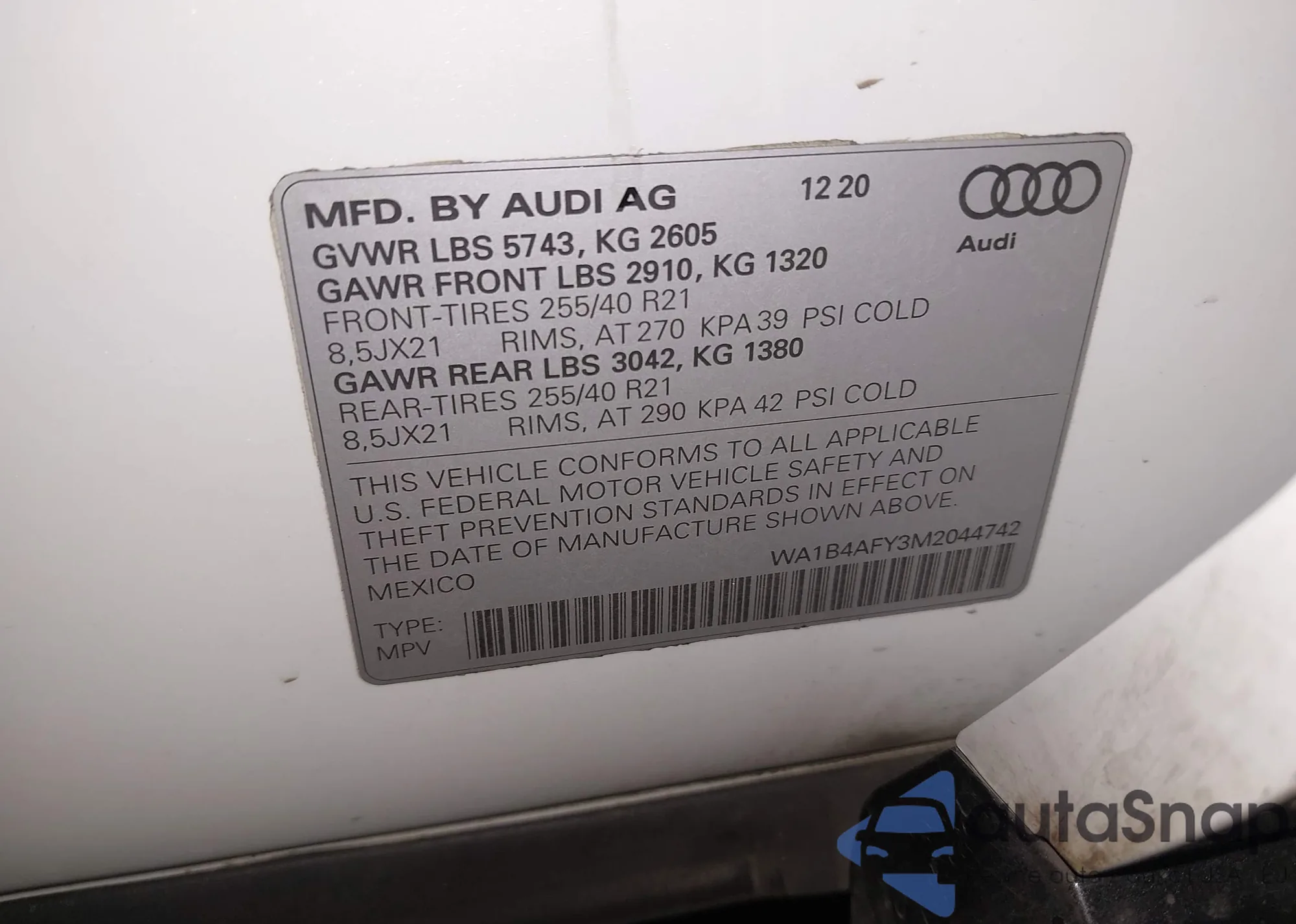 LOT: 43411133 VIN: WA1B4AFY3M2044742
