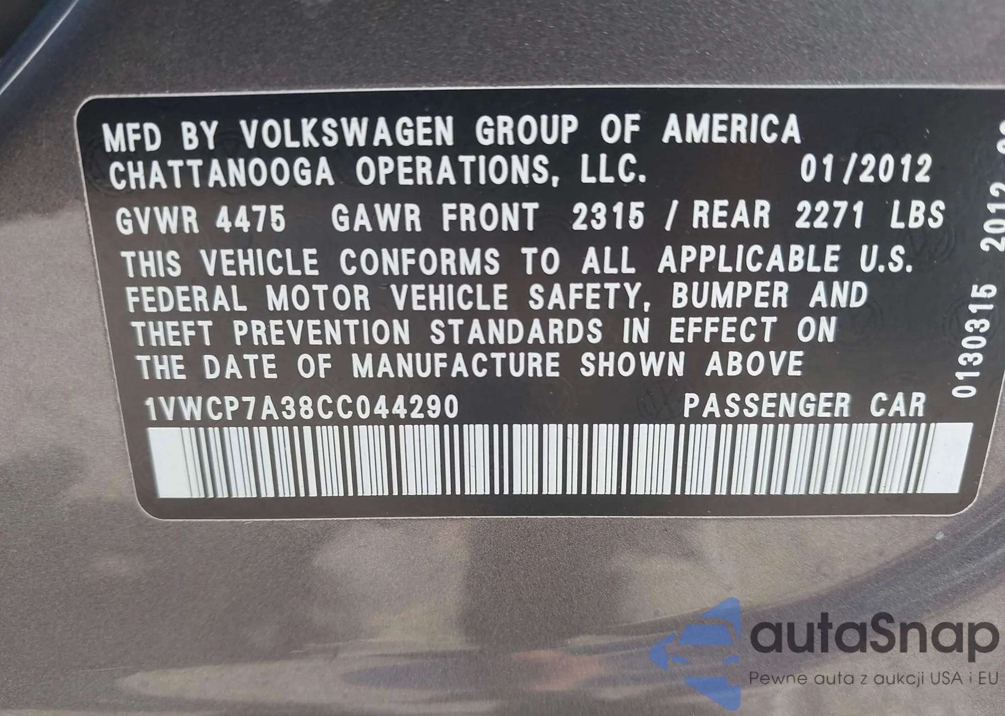 • VIN 1VWCP7A38CC044290