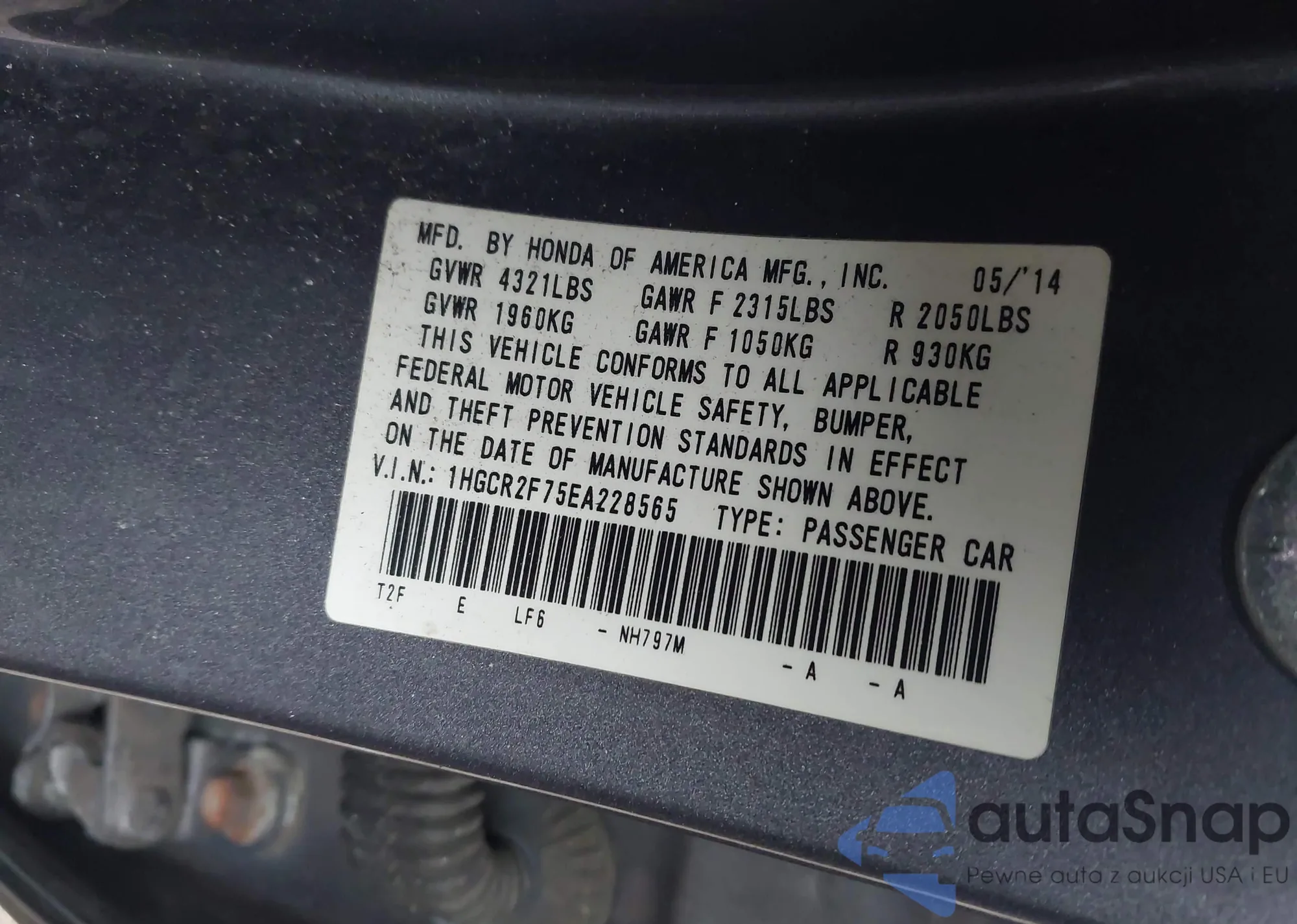 LOT: 43796334 VIN: 1HGCR2F75EA228565