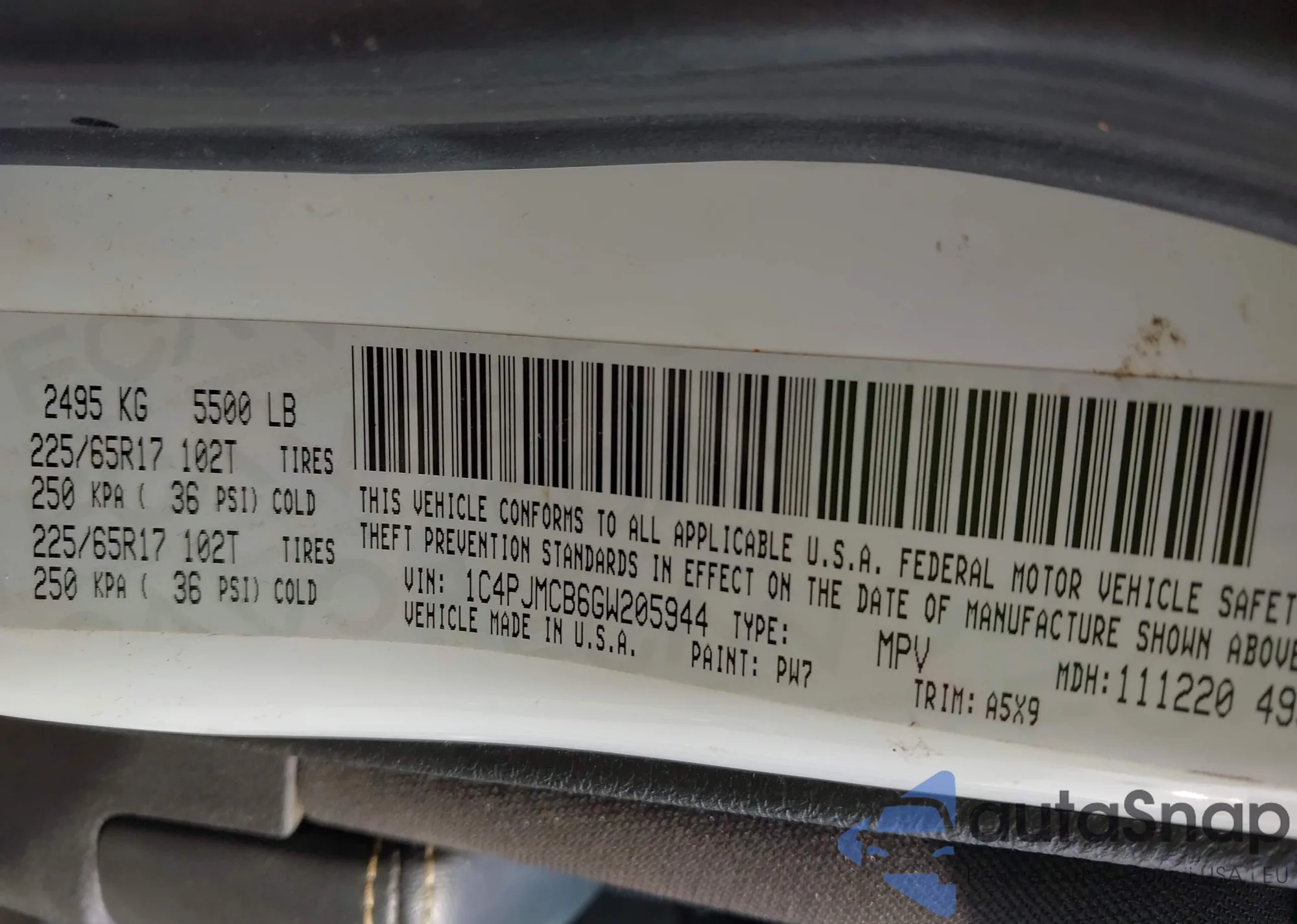 LOT: 43729714 VIN: 1C4PJMCB6GW205944