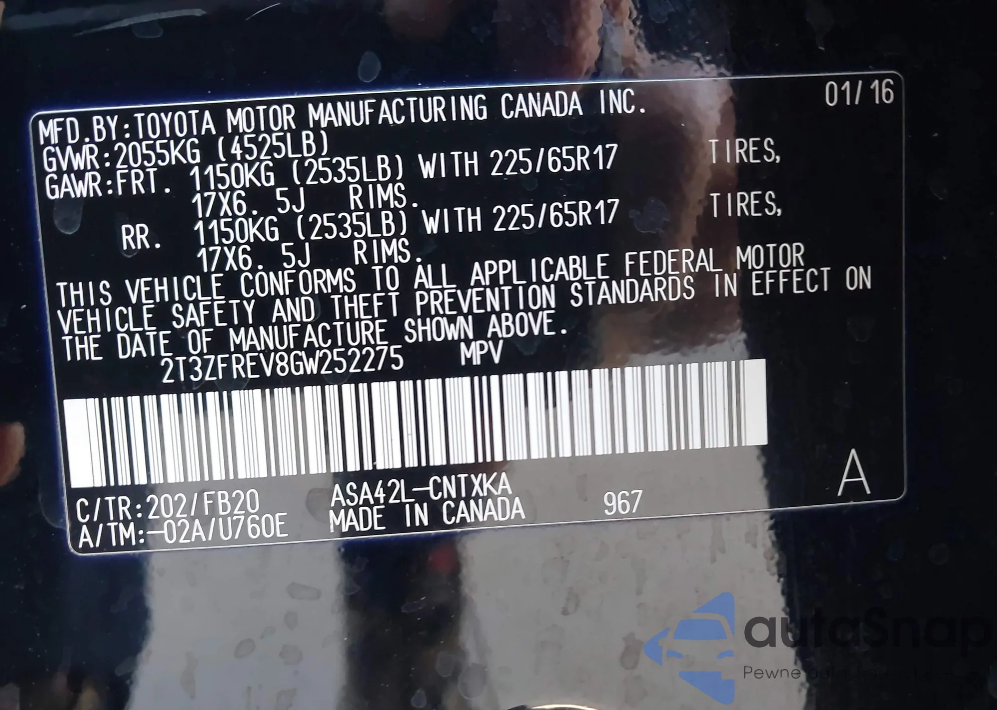 • VIN 2T3ZFREV8GW252275