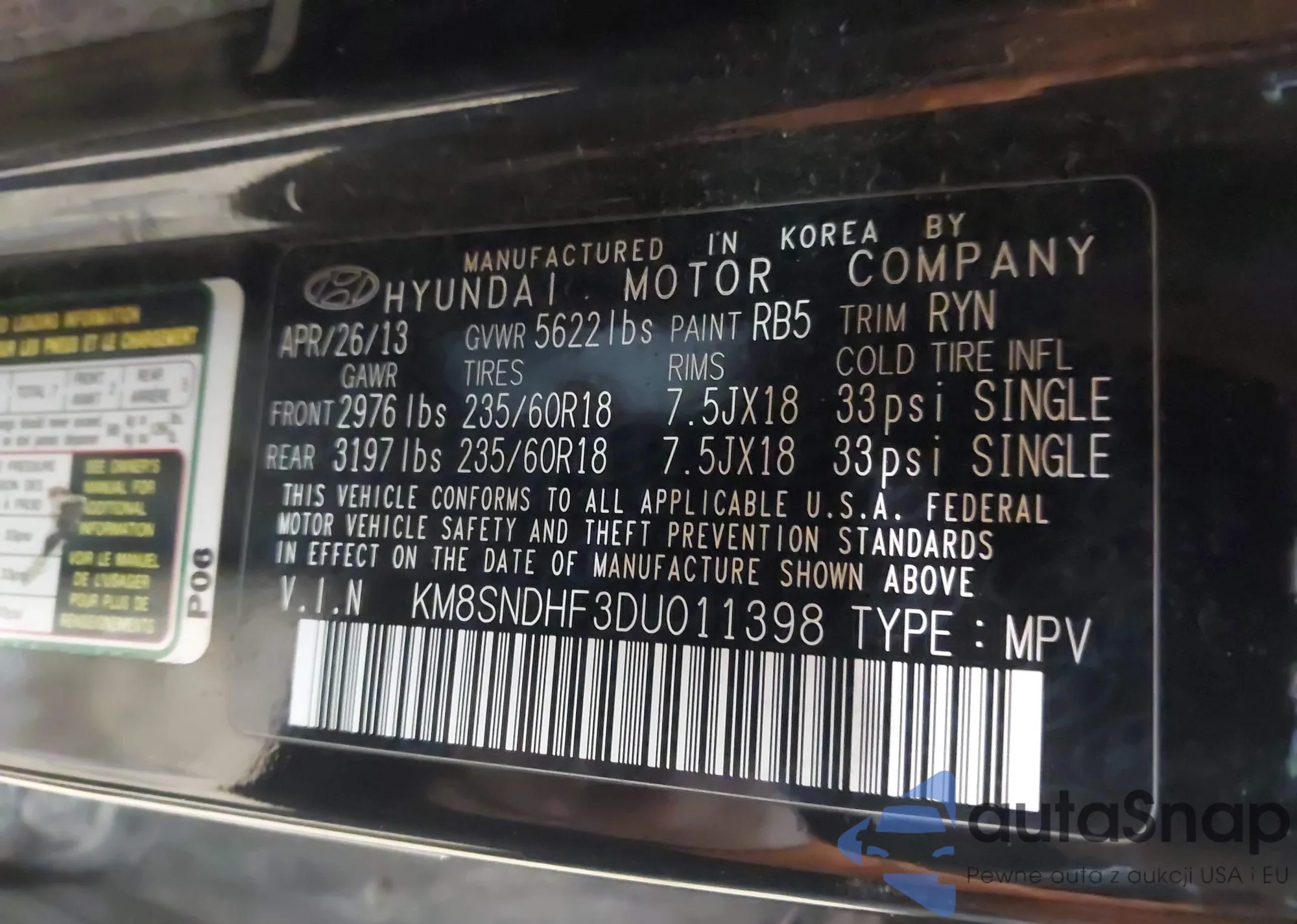 • VIN KM8SNDHF3DU011398