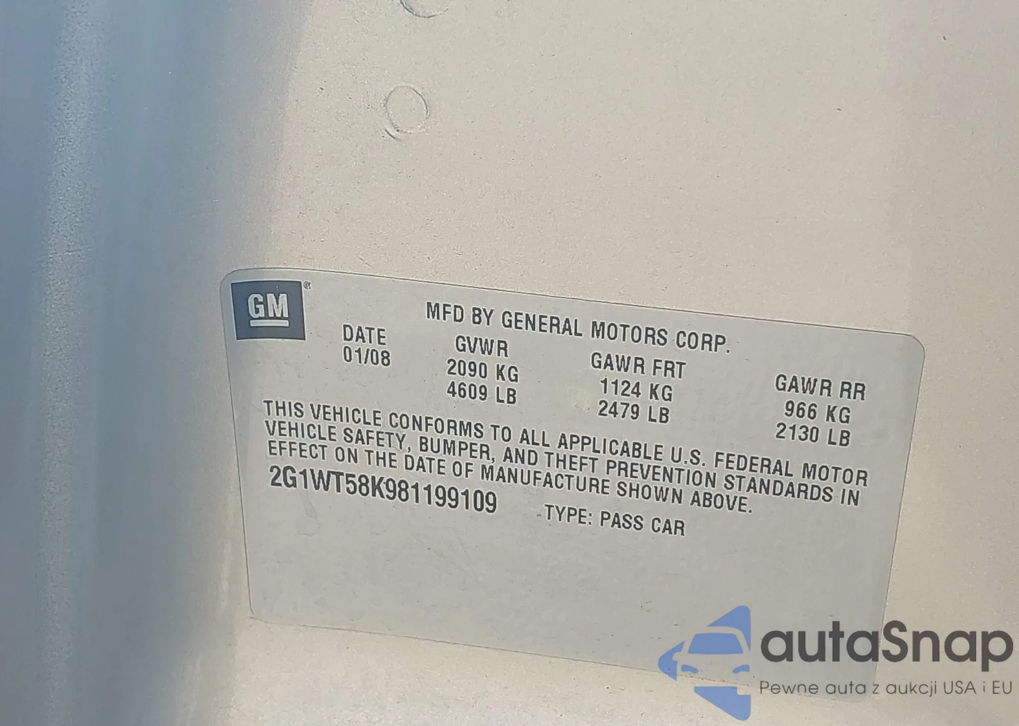 LOT: 43700767 VIN: 2G1WT58K981199109