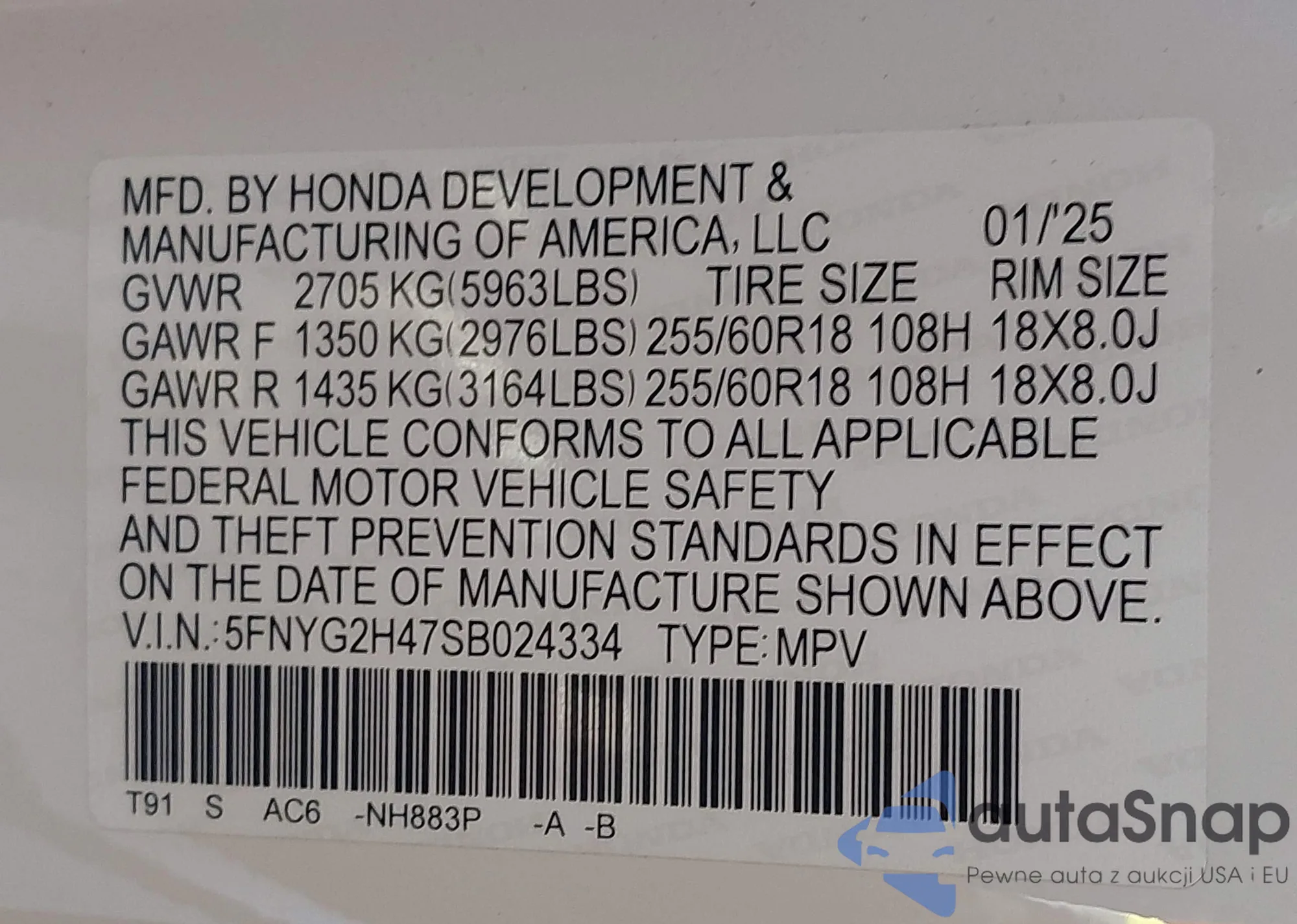 • VIN 5FNYG2H47SB024334