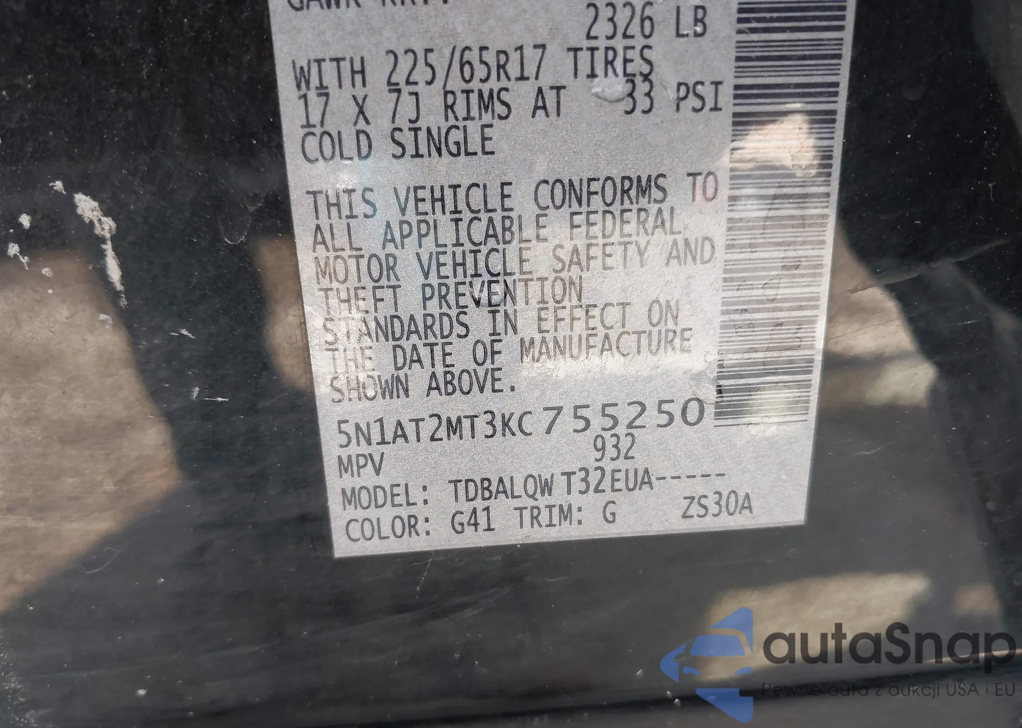 LOT: 43323608 VIN: 5N1AT2MT3KC755250