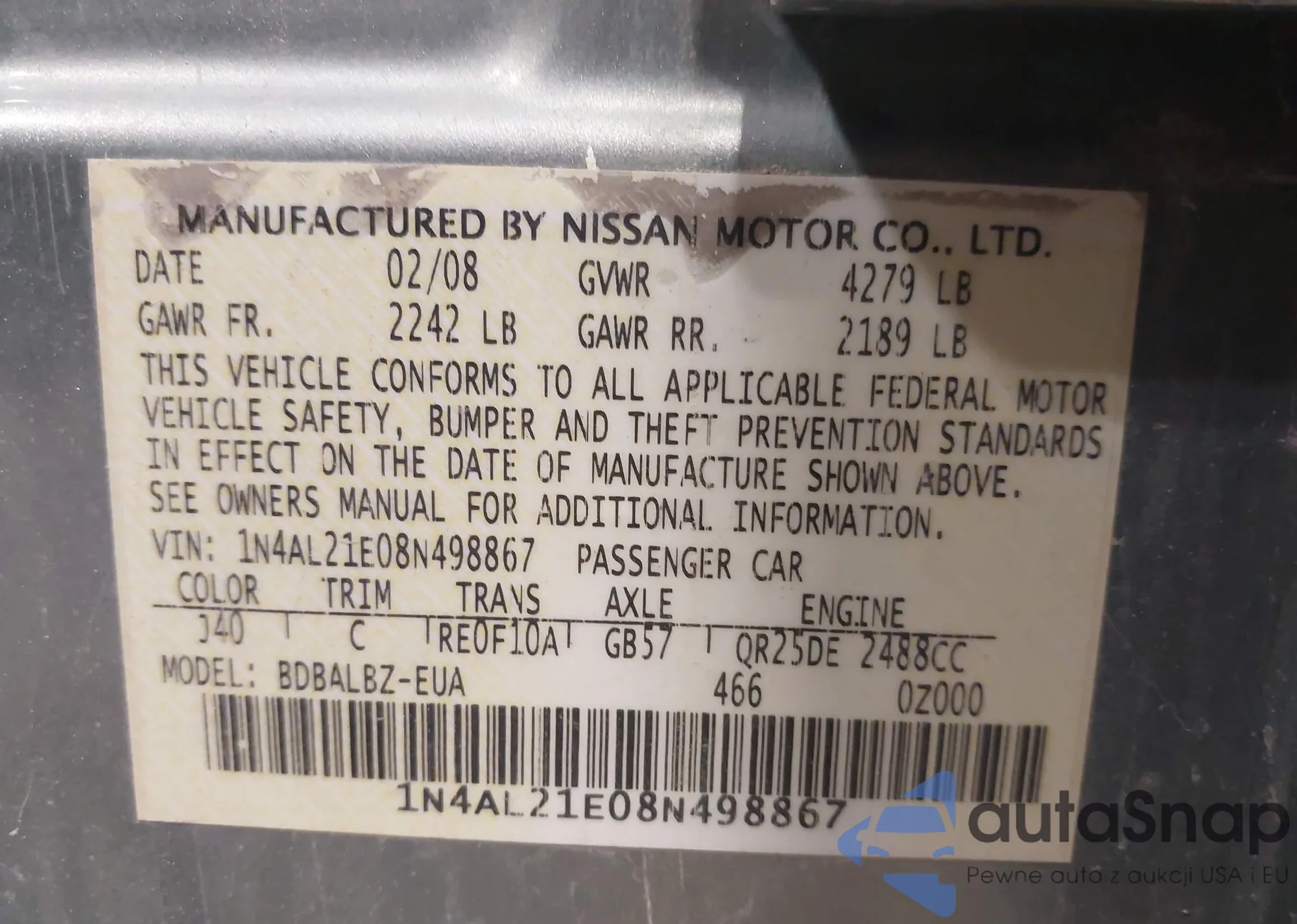 LOT: 42767720 VIN: 1N4AL21E08N498867