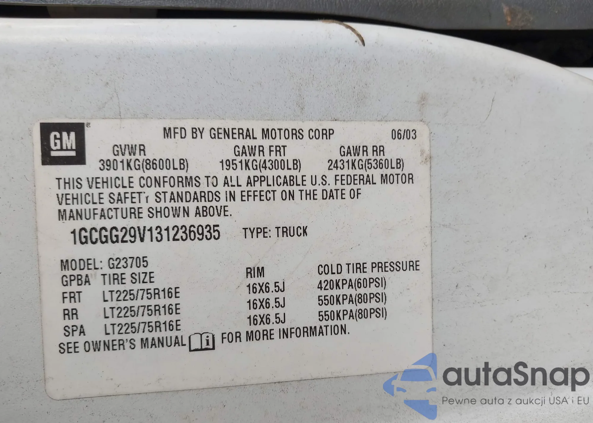 LOT: 43806783 VIN: 1GCGG29V131236935
