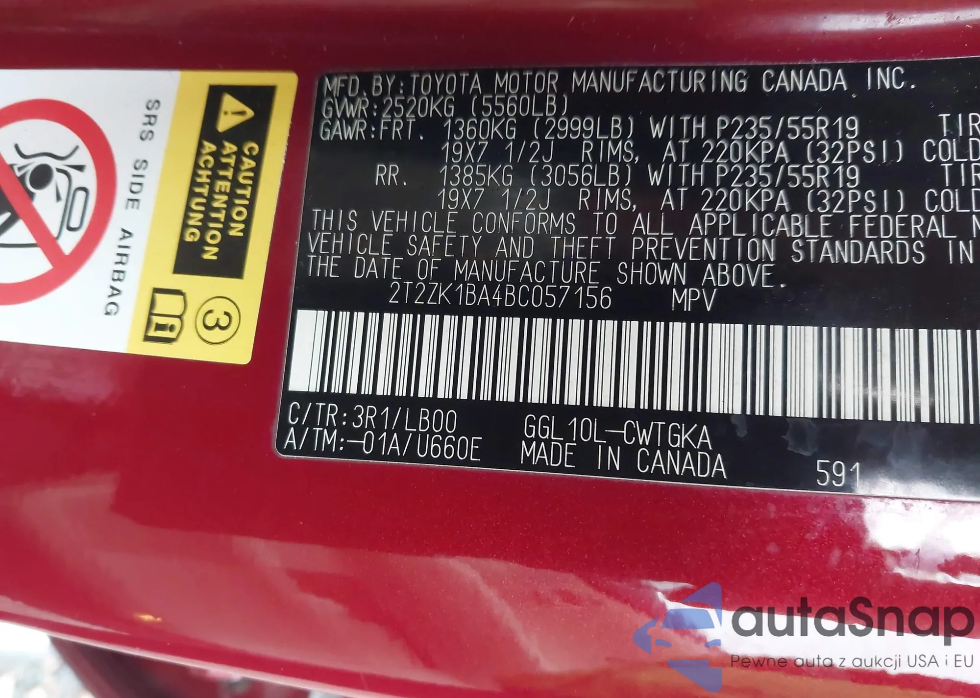 LOT: 43878236 VIN: 2T2ZK1BA4BC057156