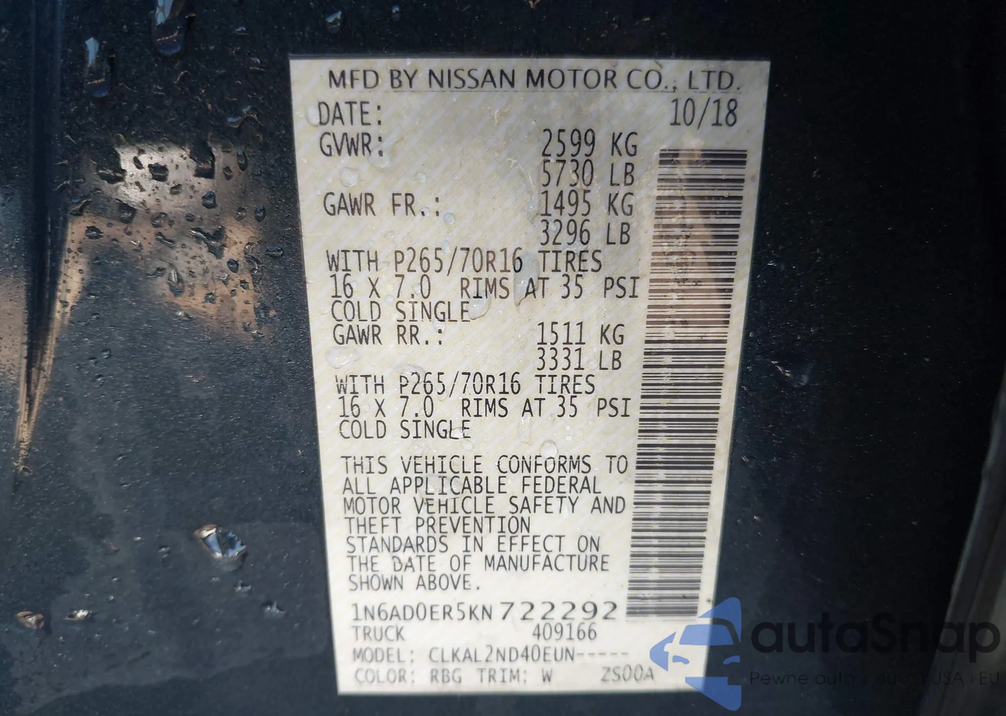 • VIN 1N6AD0ER5KN722292