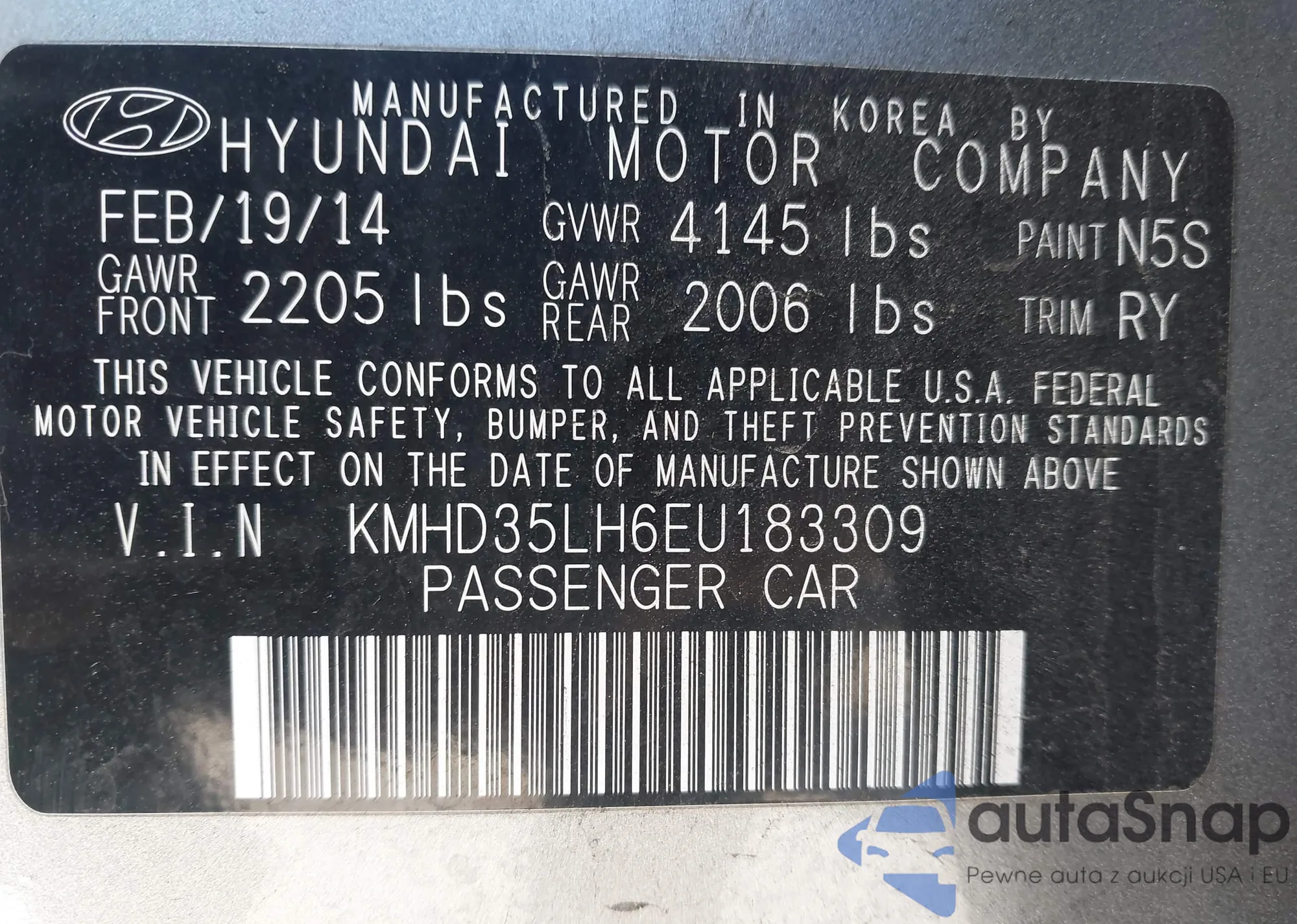 LOT: 43857940 VIN: KMHD35LH6EU183309