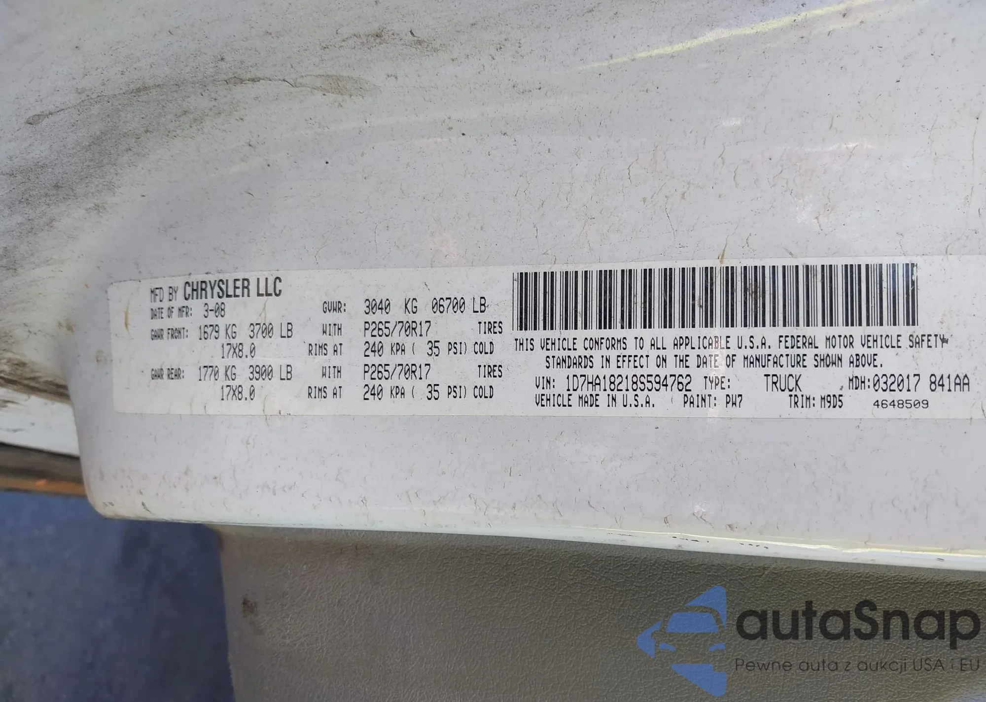 LOT: 43067218 VIN: WAUDF78E88A099274