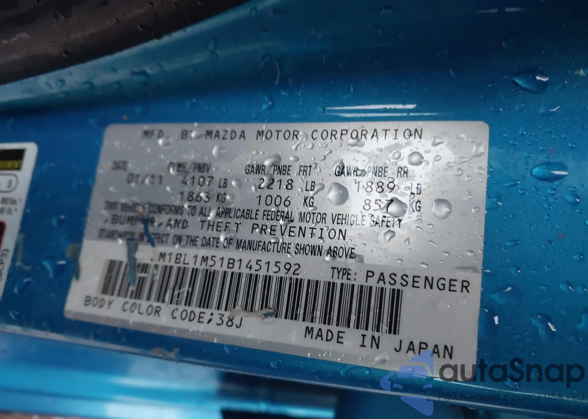 LOT: 43725321 VIN: JM1BL1M51B1451592