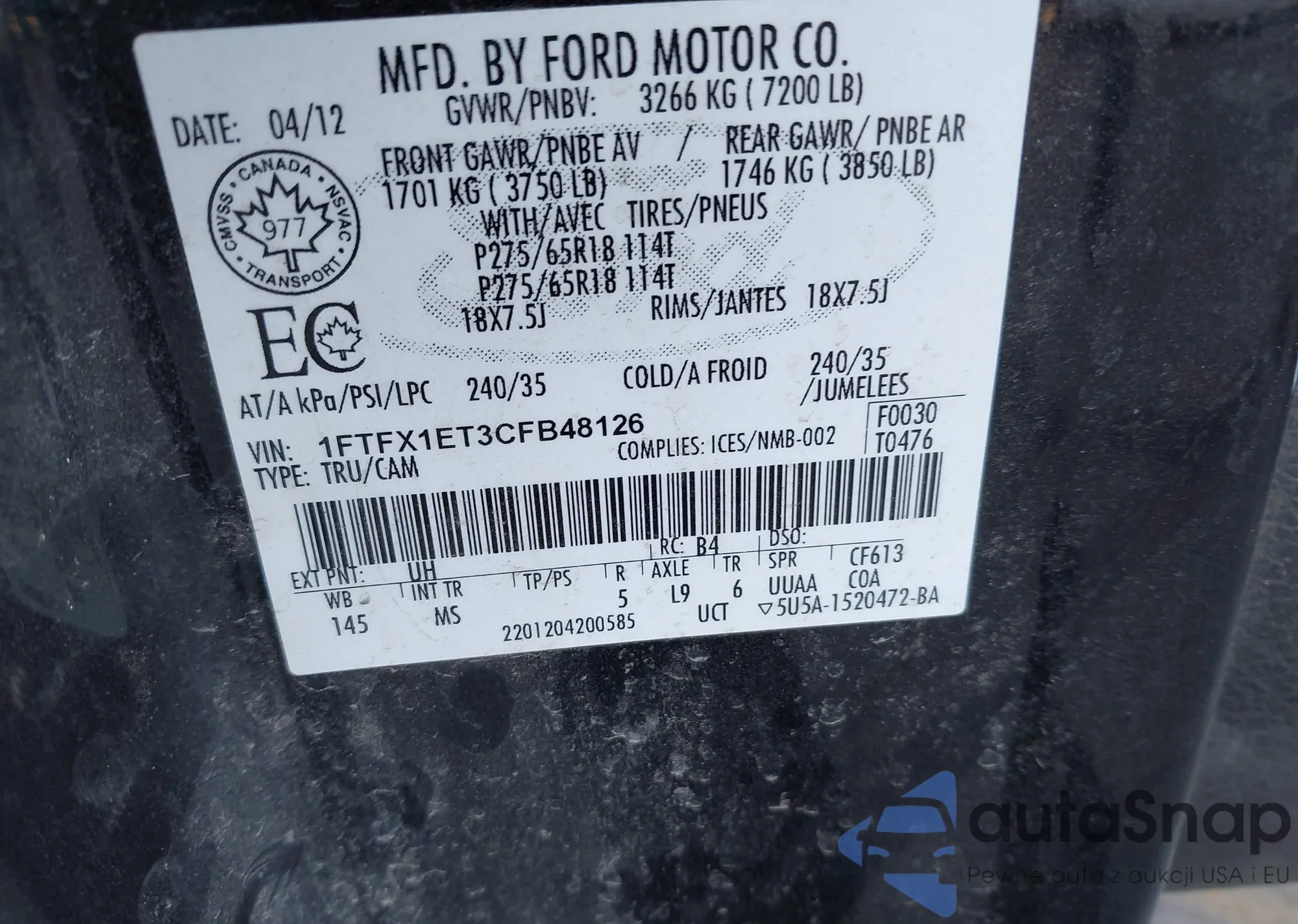 LOT: 43765607 VIN: 1FTSS34L38DA12060