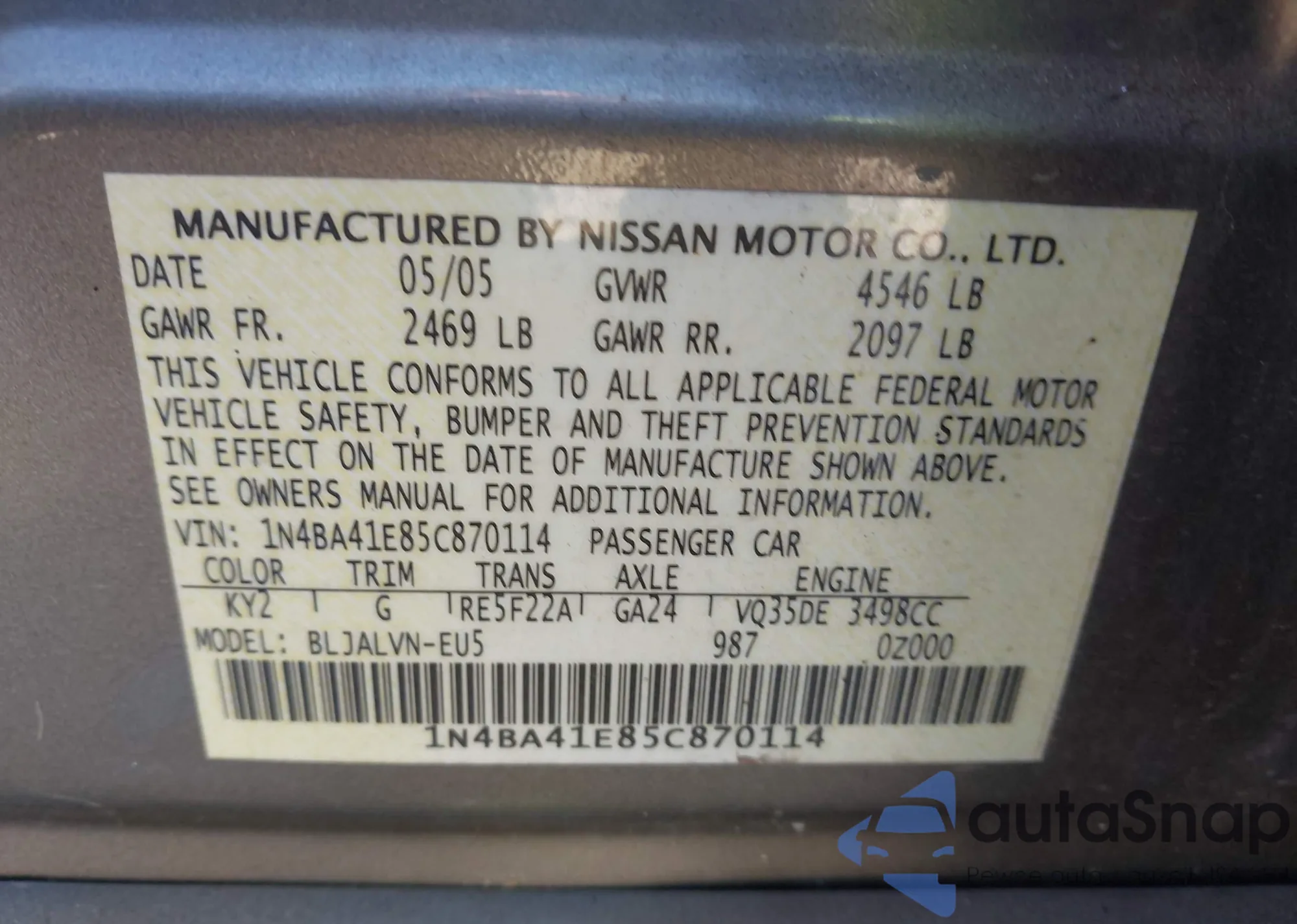 LOT: 43733975 VIN: 1N4BA41E85C870114