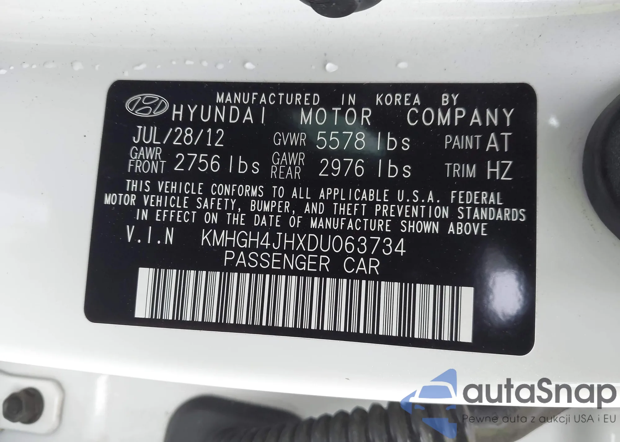 LOT: 43894357 VIN: KMHGH4JHXDU063734