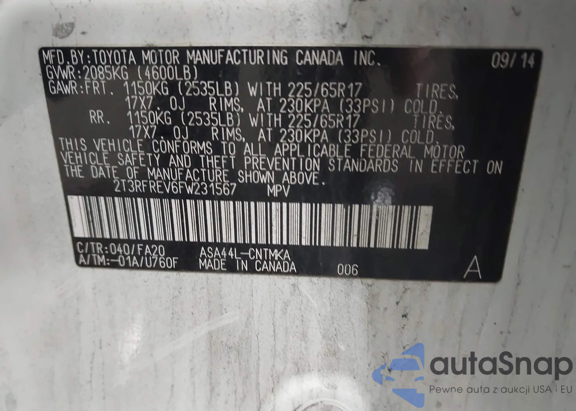 LOT: 43958161 VIN: 2T3RFREV6FW231567