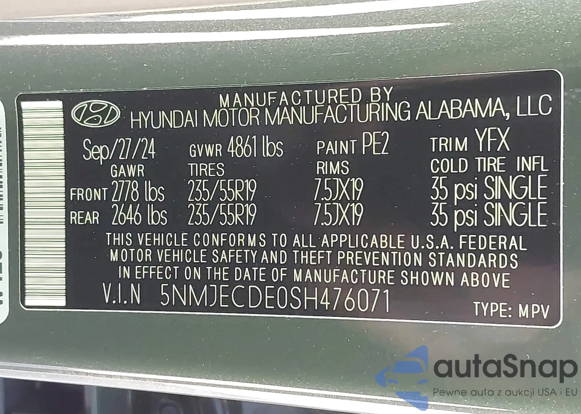 • VIN 5NMJECDE0SH476071