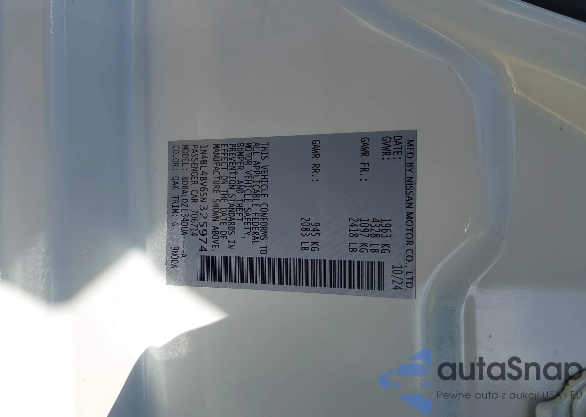 LOT: 43792478 VIN: 1N4BL4BV6SN325974