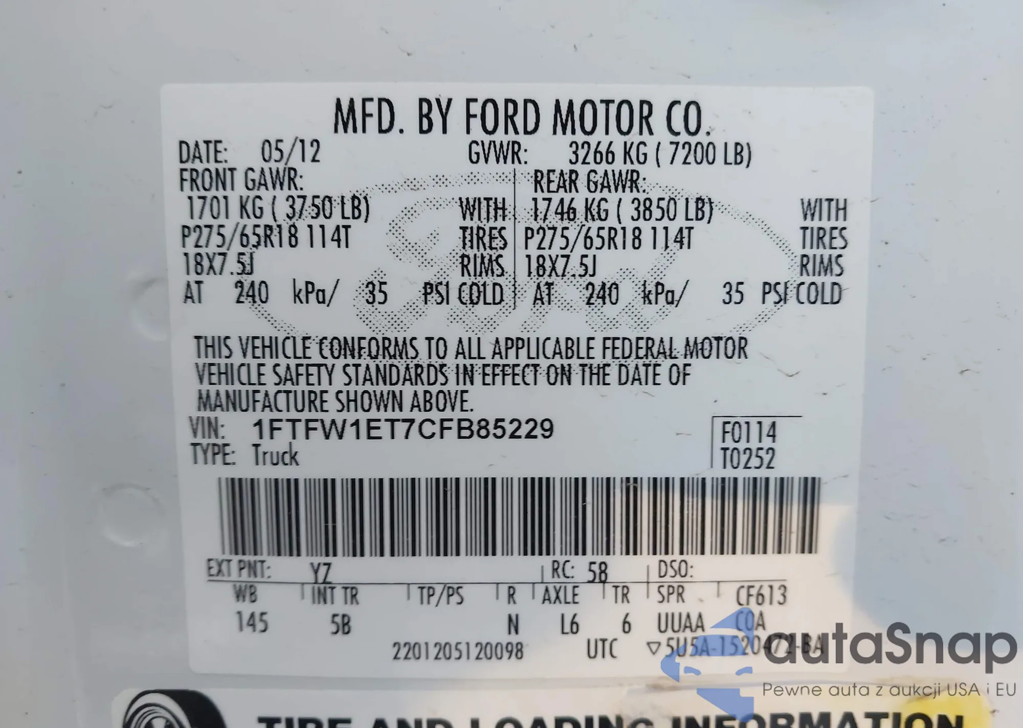• VIN 1FTFW1ET7CFB85229