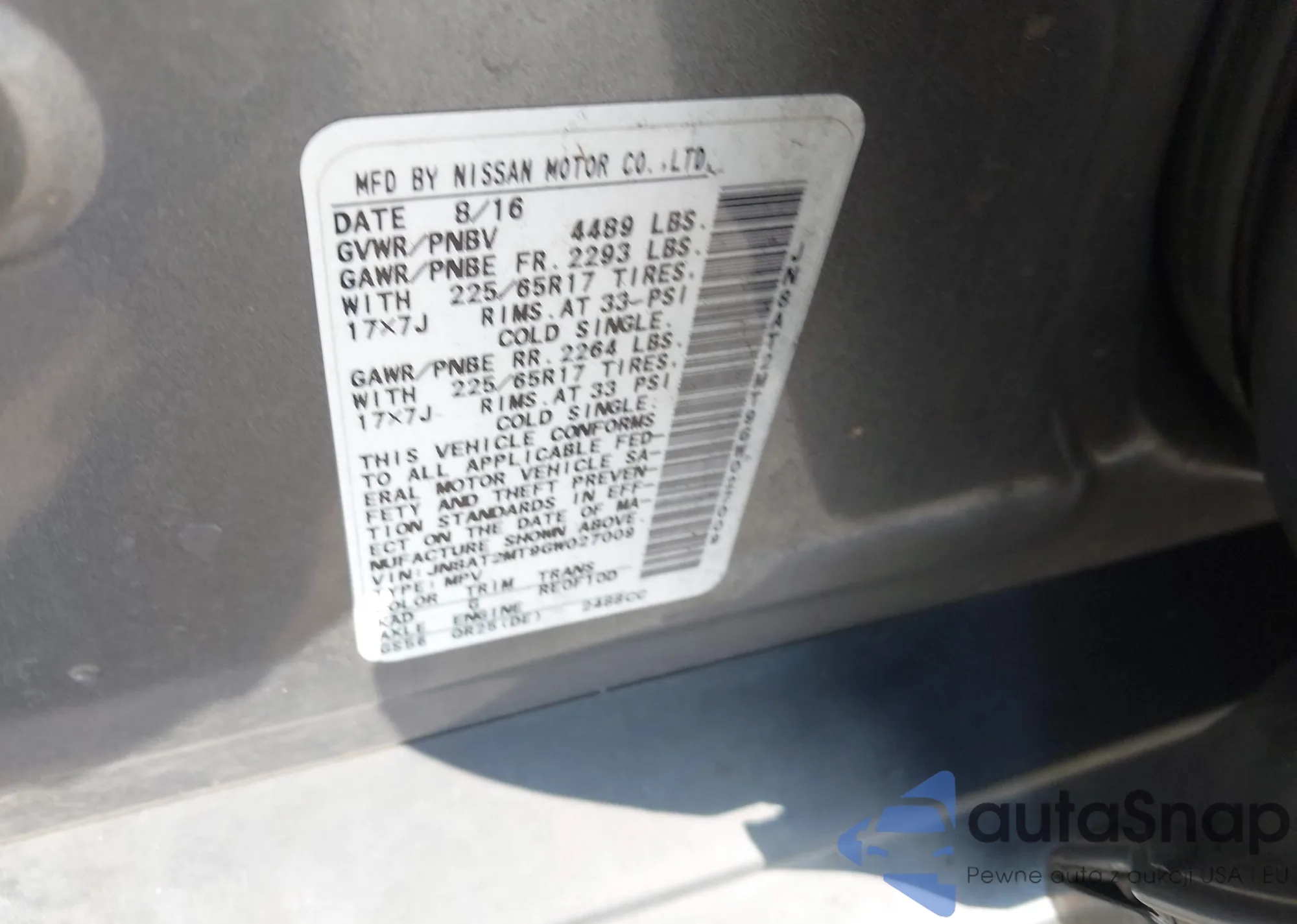 LOT: 43409387 VIN: JN8AT2MT9GW027009