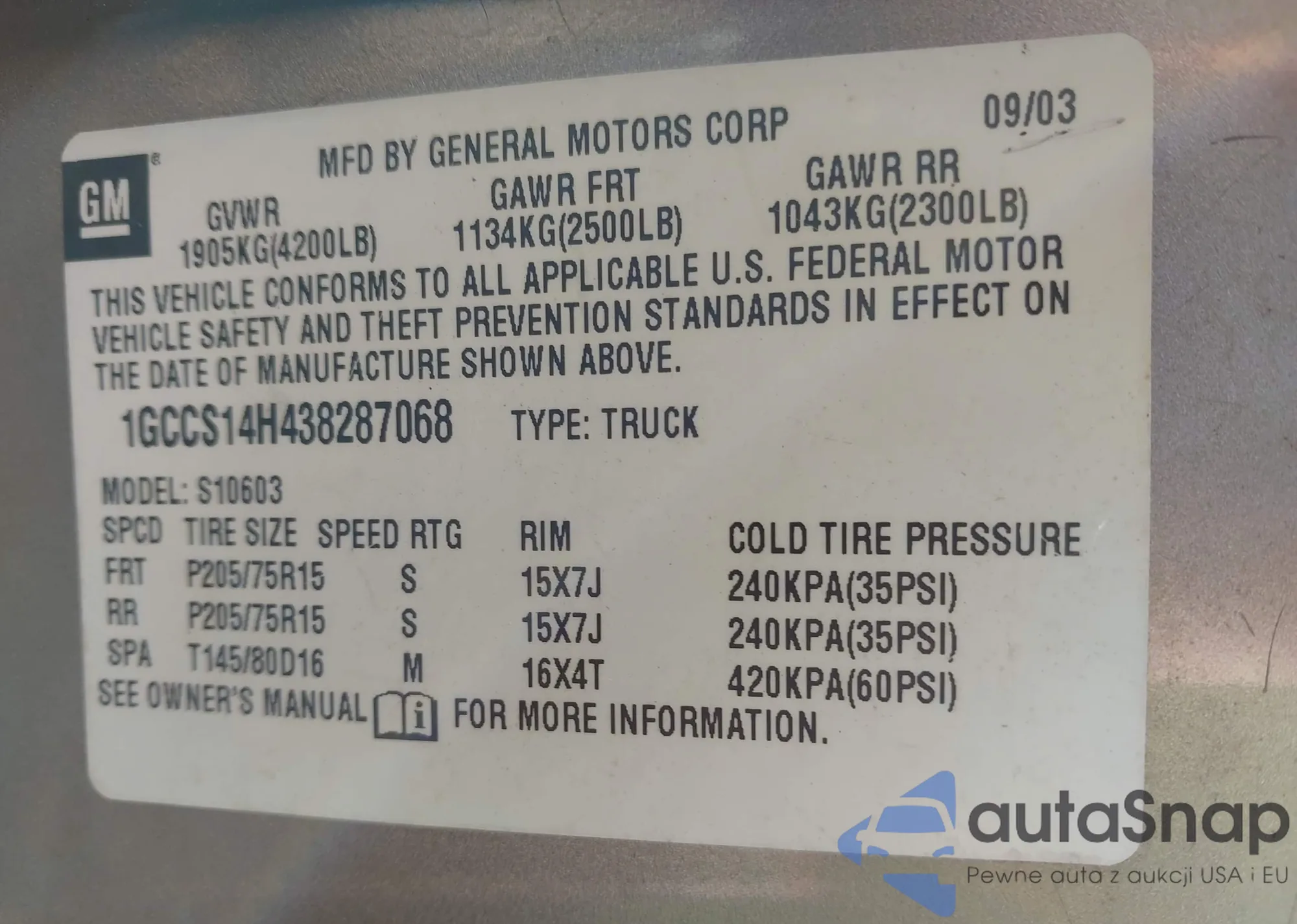 LOT: 43735340 VIN: 1GCCS14H438287068