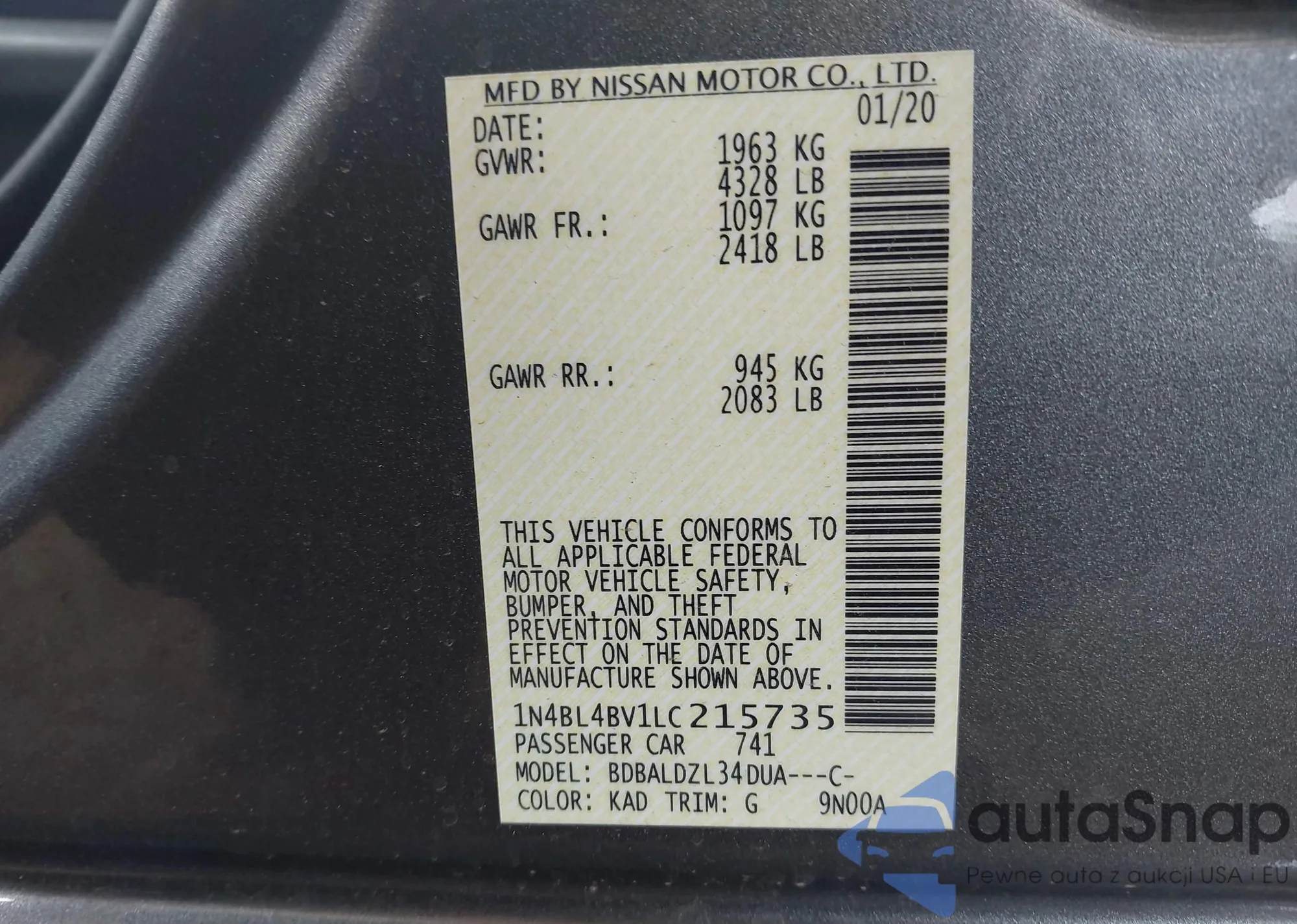LOT: 43143557 VIN: 1N4BL4BV1LC215735