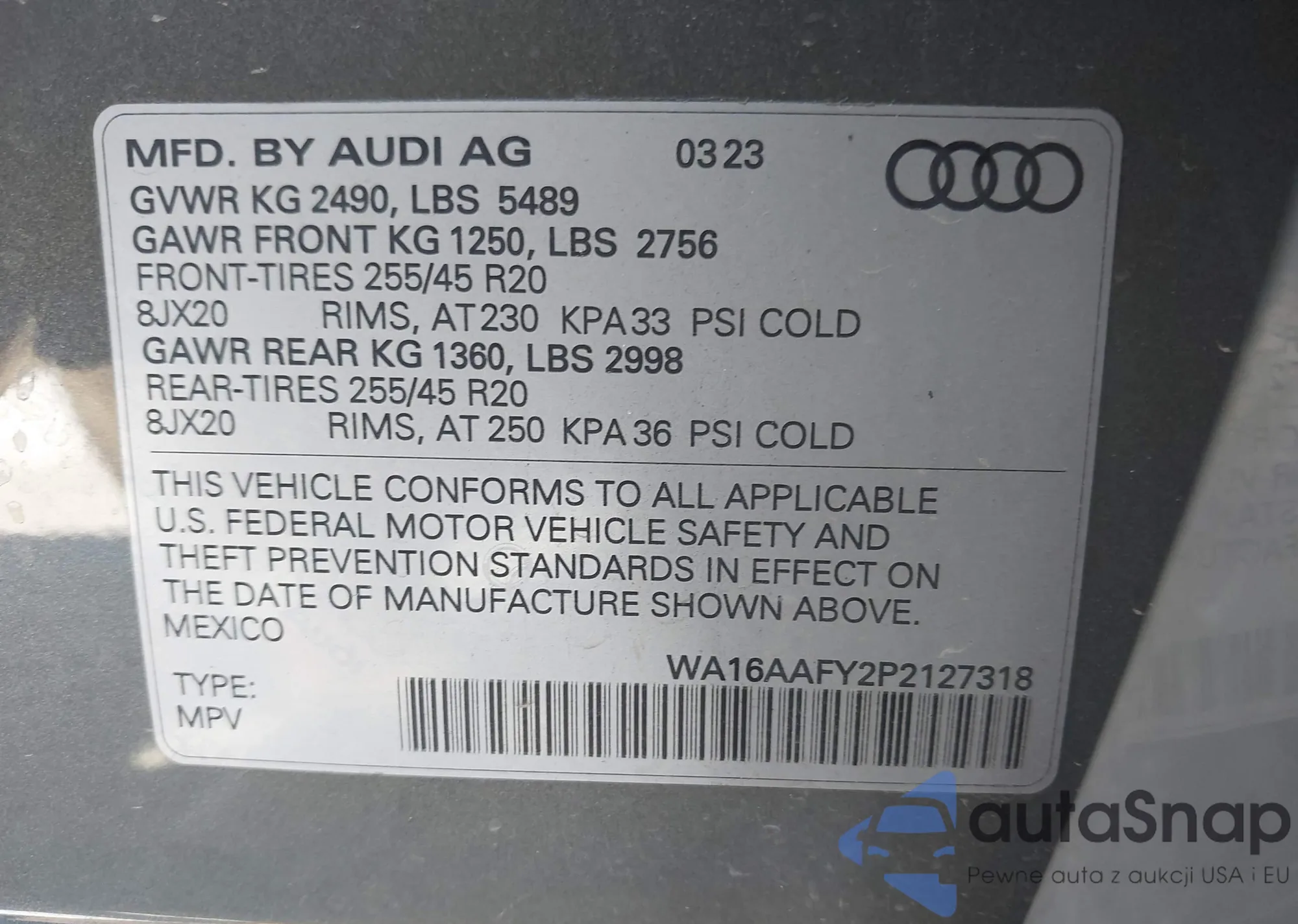• VIN WA16AAFY2P2127318