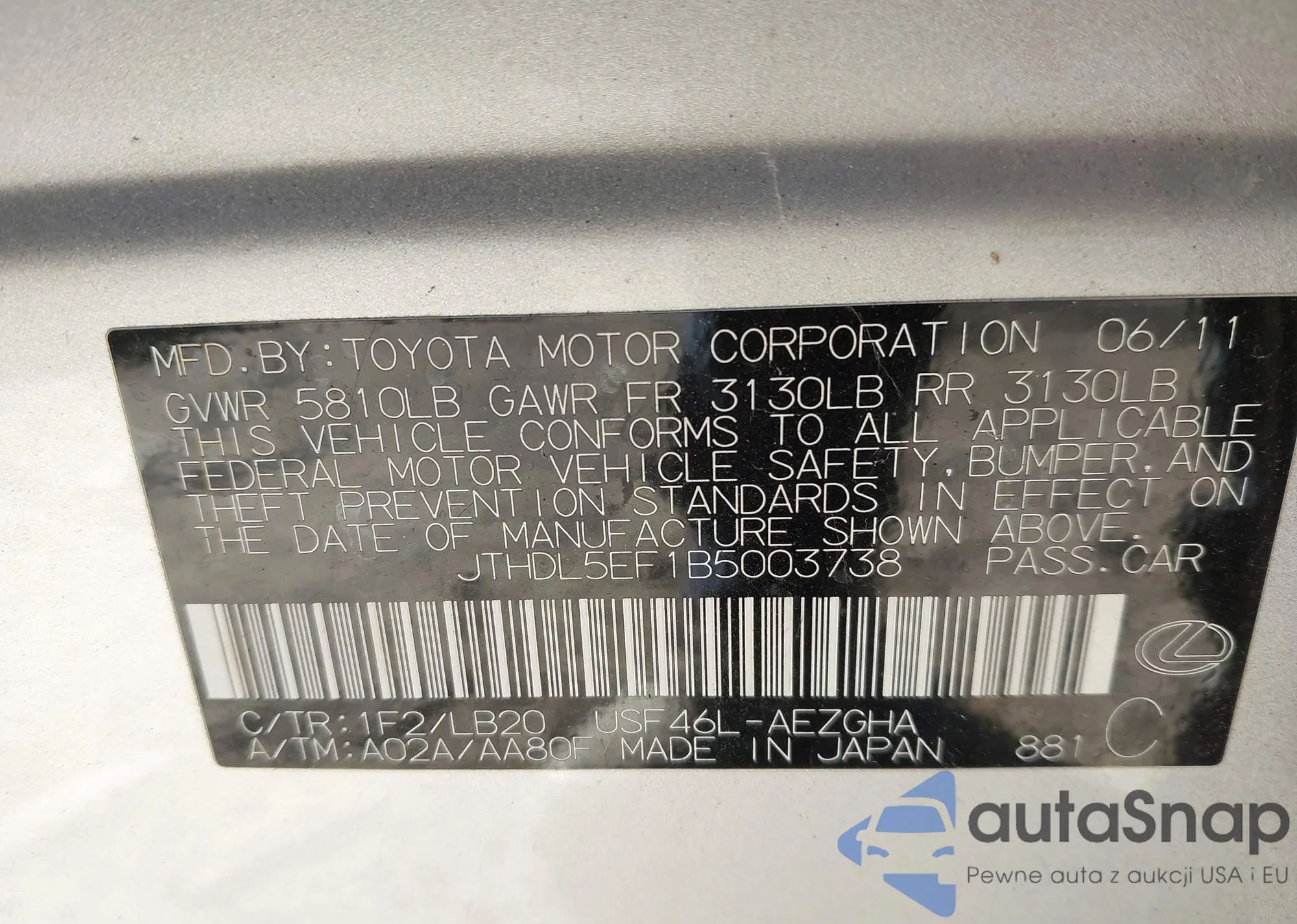 • VIN JTHDL5EF1B5003738
