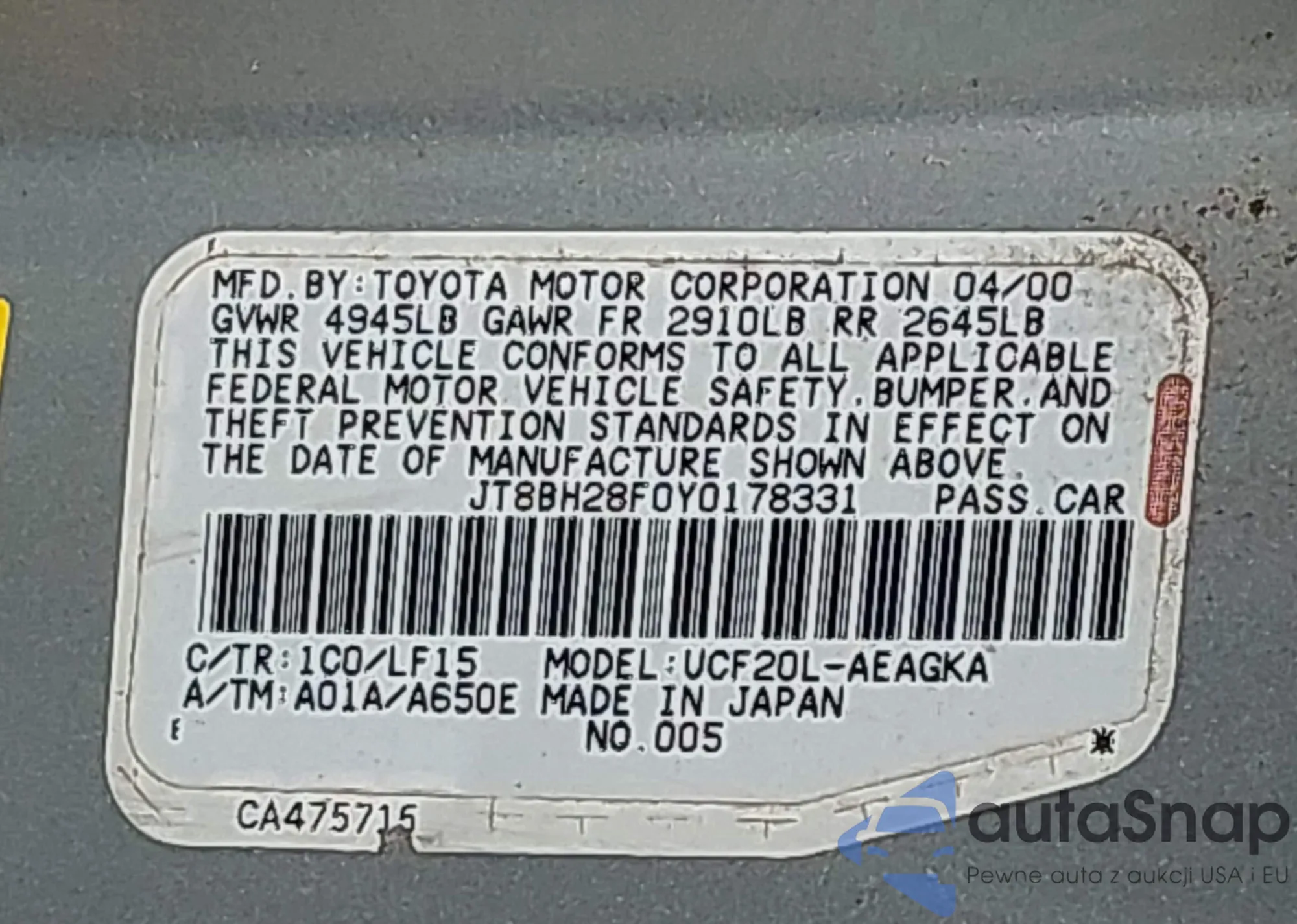 LOT: 43622786 VIN: 4T1G11AK0RU229314