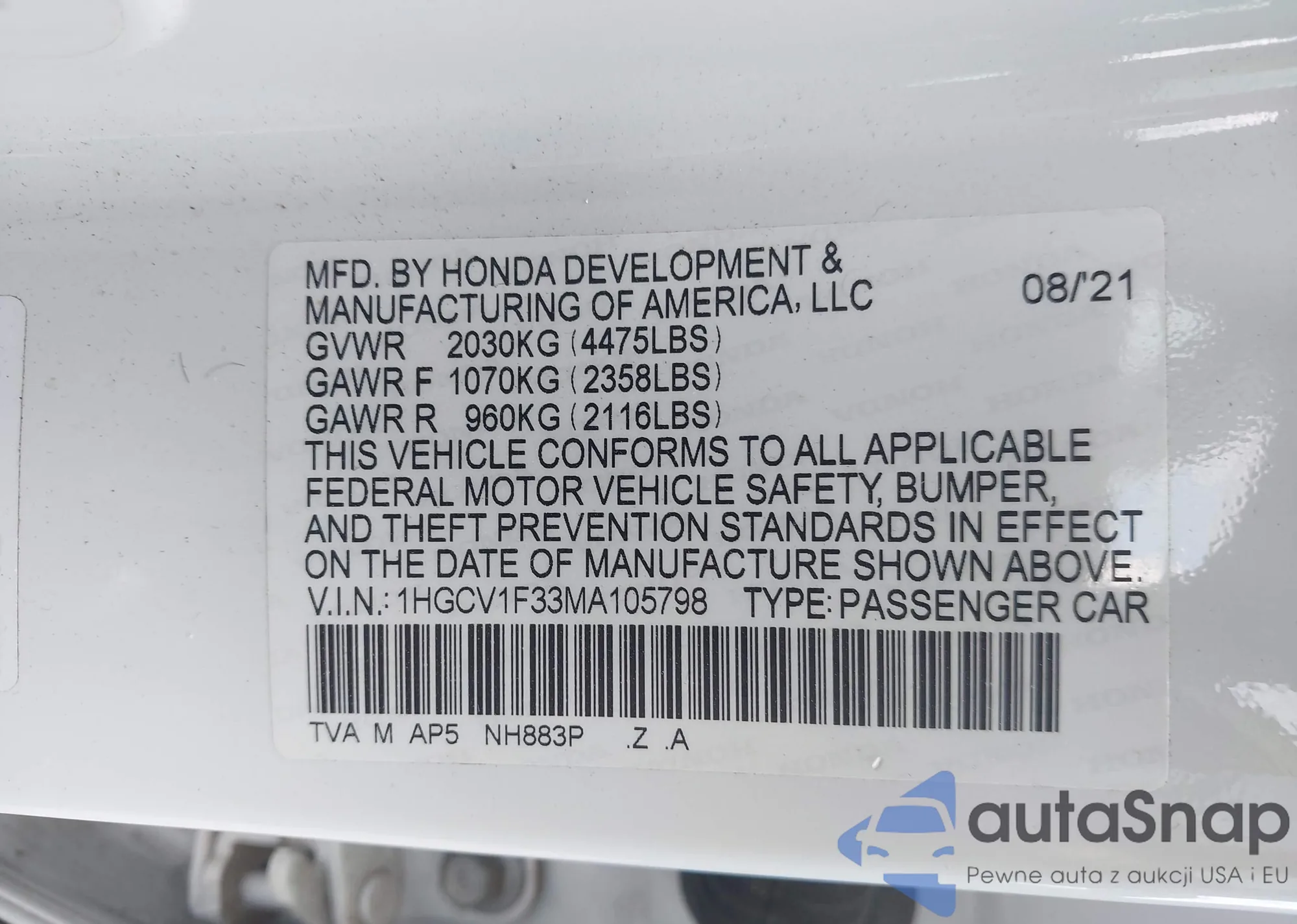 LOT: 43209384 VIN: 1HGCV1F33MA105798
